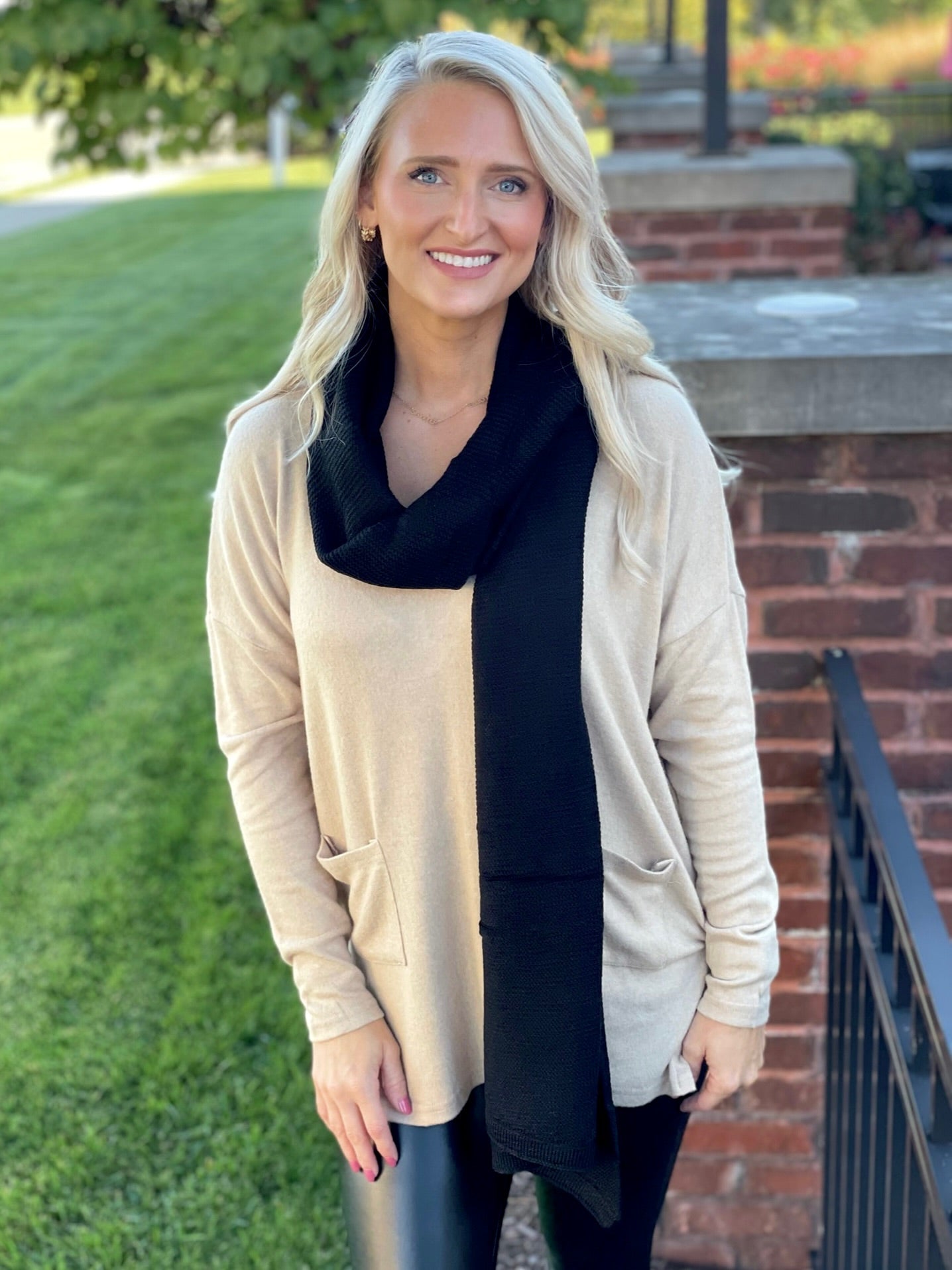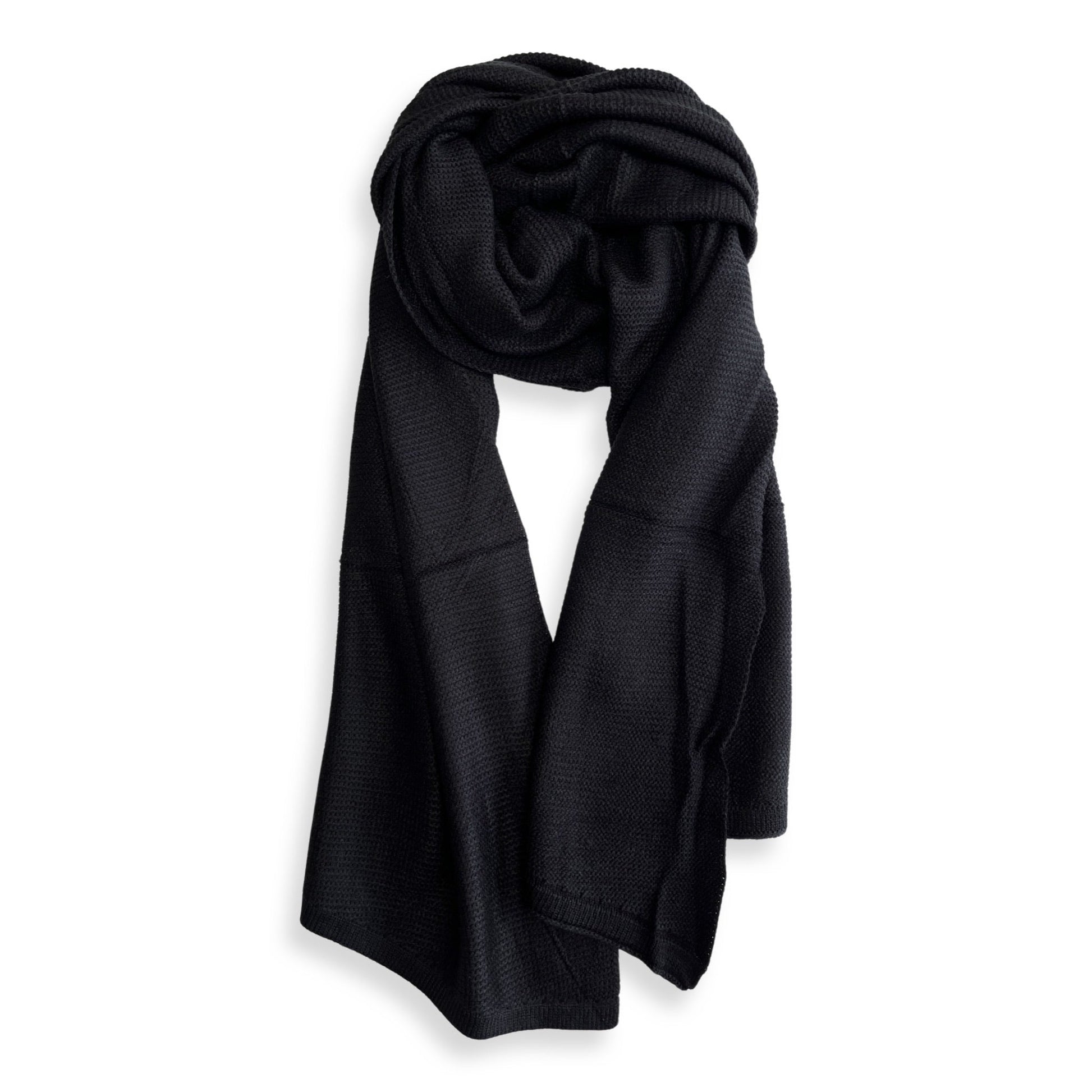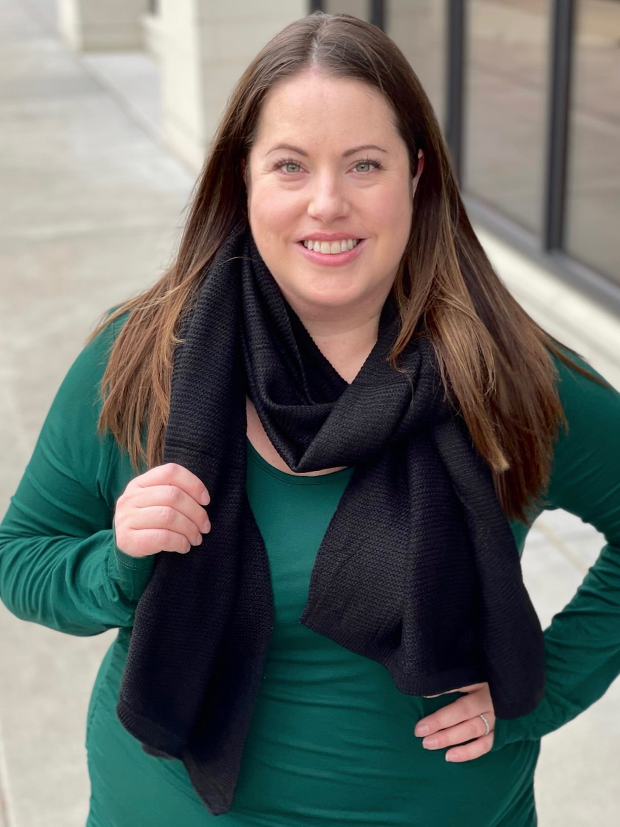 The possibilities are endless with this black scarf! Style it with a dress or long sleeve top for those cool fall and winter days. It is the perfect accessory for any outfit.