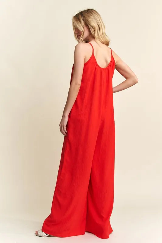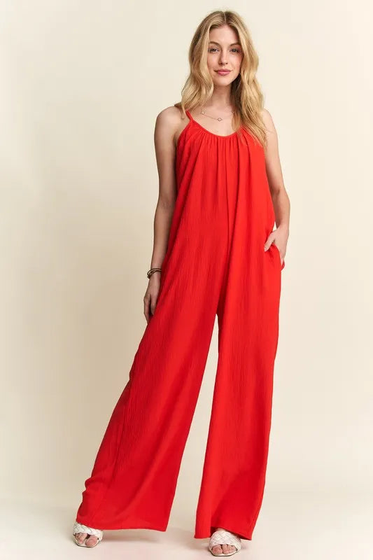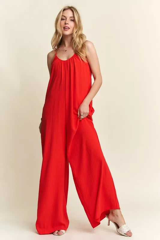 A wide leg casual cami jumpsuit combines comfort and style for a relaxed yet chic look. The wide-leg pants offer a breezy and flowy silhouette, while the cami top adds a touch of elegance. This jumpsuit is perfect for casual outings, brunch dates, or even a day at the beach. Pair it with sandals and statement jewelry for a laid-back yet trendy outfit.