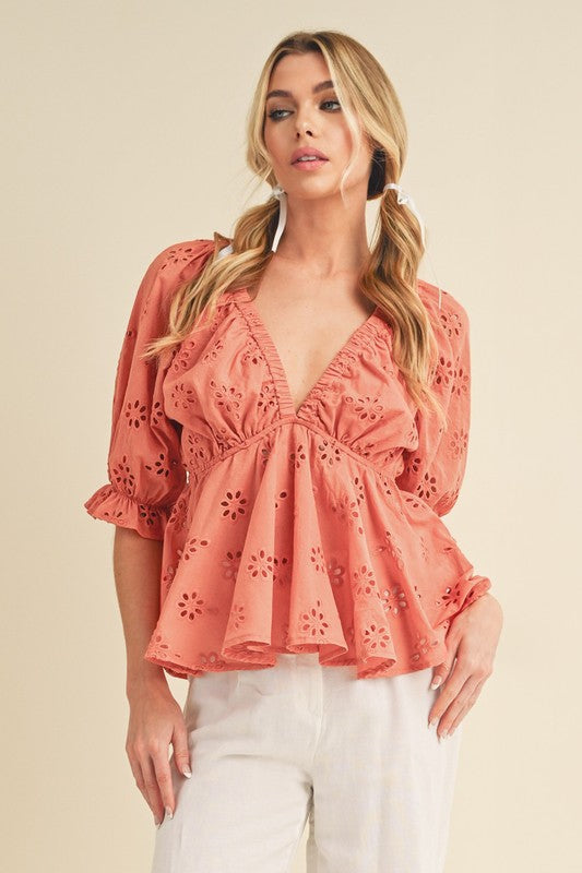 The Eyelet Embroidered V-Neck Half Sleeve Peplum Blouse is a chic and feminine top featuring delicate eyelet embroidery detailing. The V-neck design adds a touch of sophistication, while the peplum style creates a flattering silhouette. The half sleeves offer a stylish look suitable for various occasions. Pair this blouse with trousers or a skirt for a charming and elegant outfit.