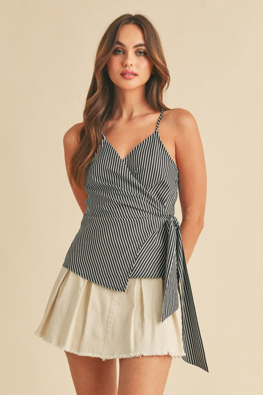 A side knotted surplice striped cami is a variation of the traditional surplice cami with an added side knot detail. This style typically features a surplice neckline, creating a faux wrap look, and has a knotted detail on one side of the waist. The striped pattern adds a stylish touch to the top. This design offers a unique and trendy twist to the classic cami silhouette, making it a versatile piece that can be dressed up or down depending on the occasion.