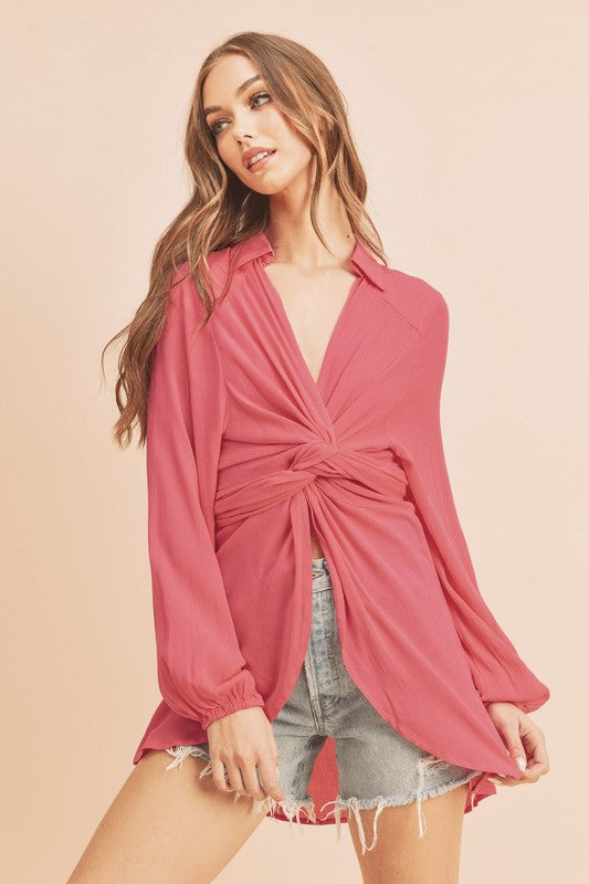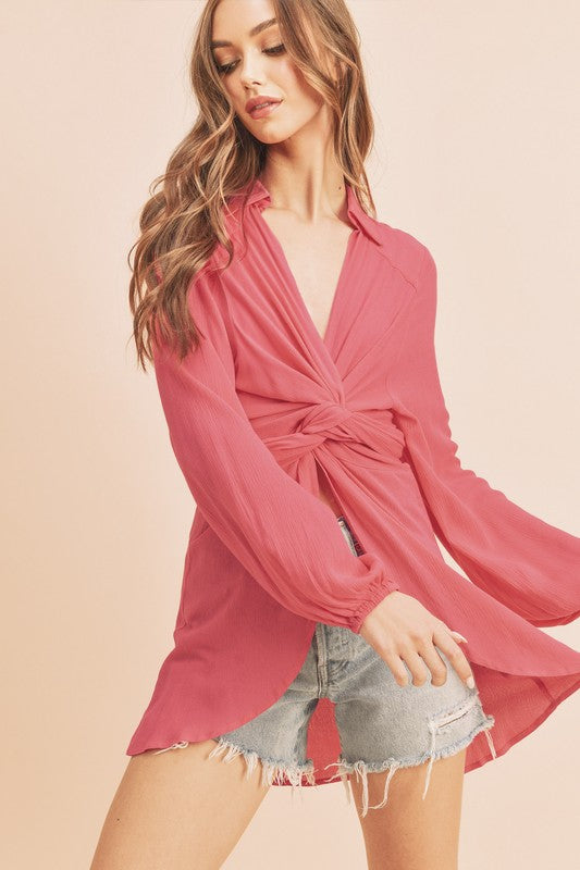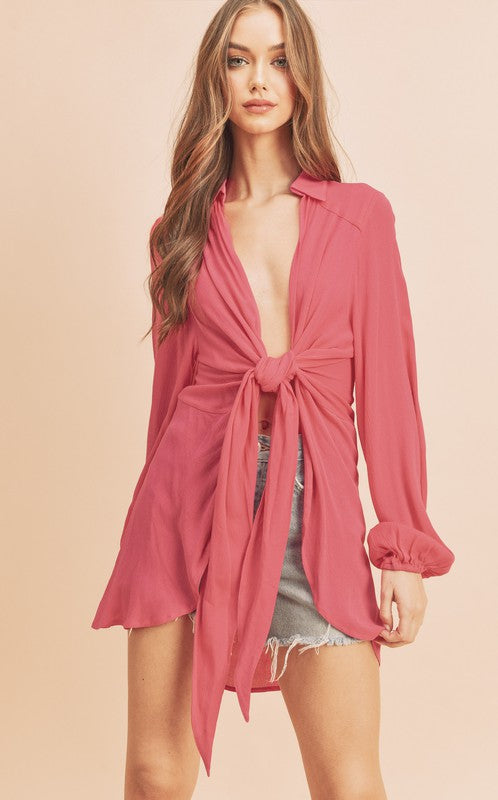 Perfect for lounging out, the top features a classic collar with lower back hemline for added dimension. Wear her tied at the front or wrapped at the waist.