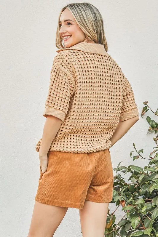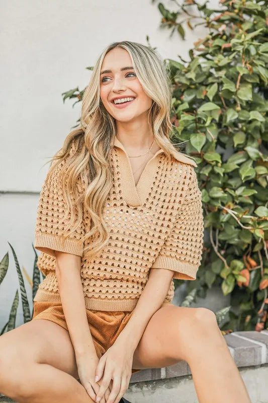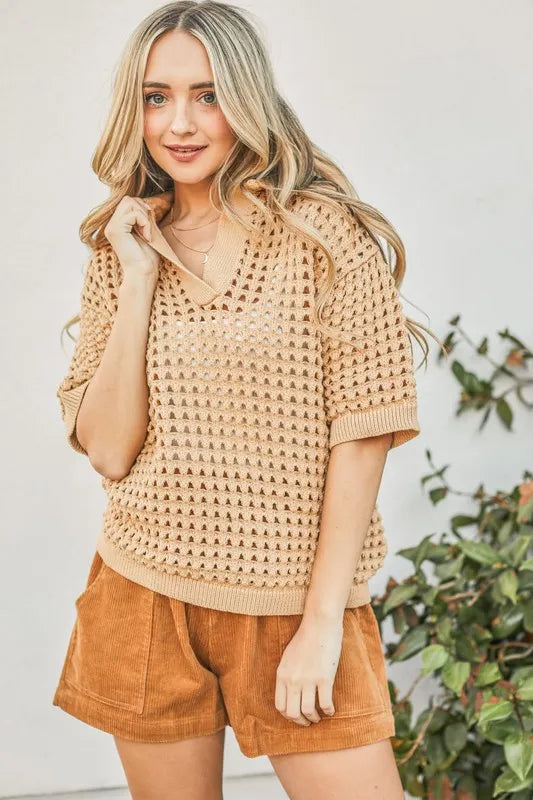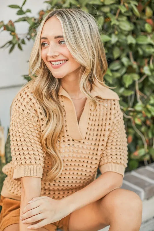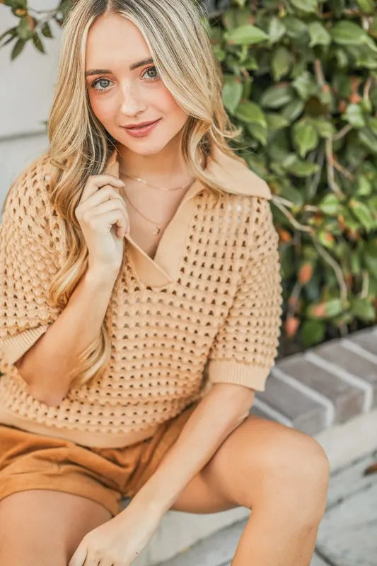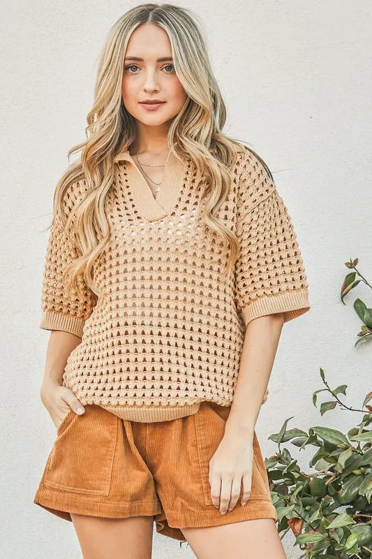 A hollow out polo sweater top is a stylish and modern piece that combines the casual vibe of a polo shirt with the warmth and texture of a sweater, featuring hollow-out detailing for added flair. This unique design creates a chic and edgy look, perfect for layering over a camisole or bralette for a stylish outfit. The polo collar adds a preppy and sporty touch to the sweater top, while the hollow-out details give it a trendy and contemporary feel. This top can be dressed up with tailored pants or skirts for a more polished look, or paired with jeans for a casual yet fashionable ensemble. Overall, a hollow out polo sweater top is a versatile and statement-making piece that can elevate your wardrobe with its modern and stylish design.