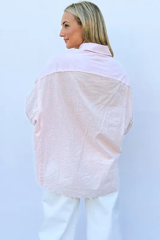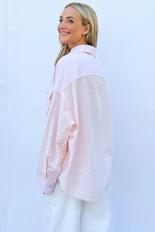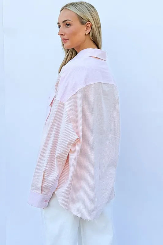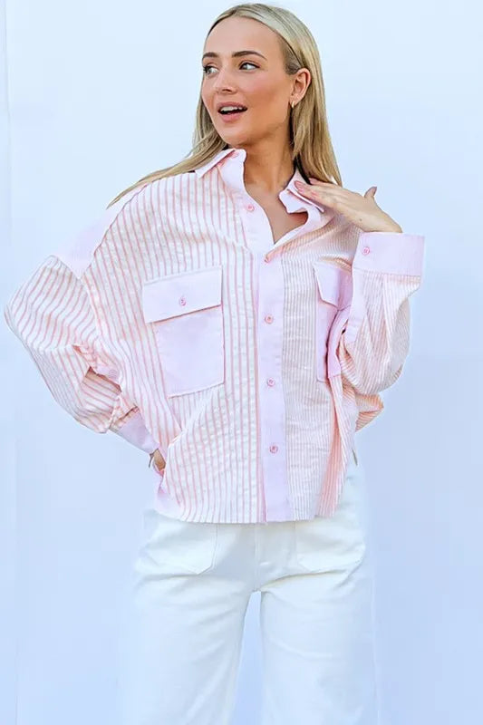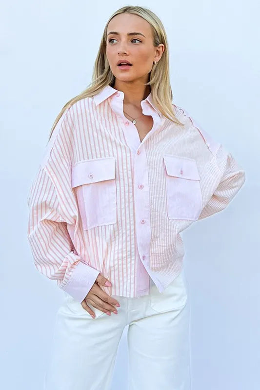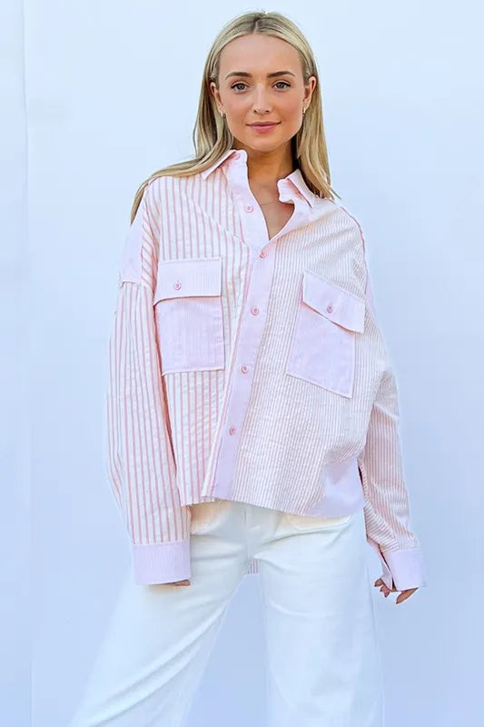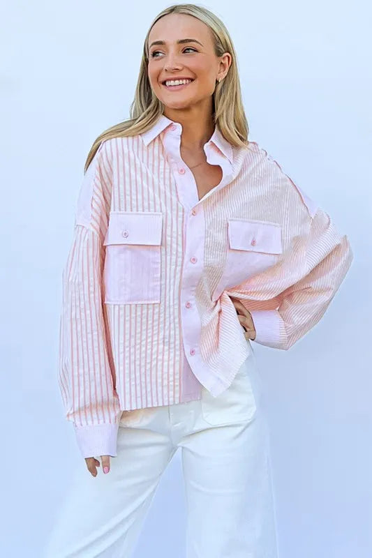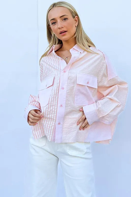 The multi-striped mix-match patched pocket shirt is a unique and eye-catching piece that adds a fun and playful element to your wardrobe. The mix of stripes and patched pockets creates a bold and eclectic look, perfect for expressing your individual style. This shirt is versatile and can be dressed up with tailored pants or down with jeans for a casual yet trendy outfit. Make a statement with this fun and dynamic addition to your wardrobe.