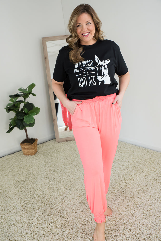 In a World Full of Unicorns, be a Bad A**! Celebrate your accomplishments and proudly display who you are. Wear this black graphic tee with our Be Your Best Lounge Joggers in Coral to add a pop of color.