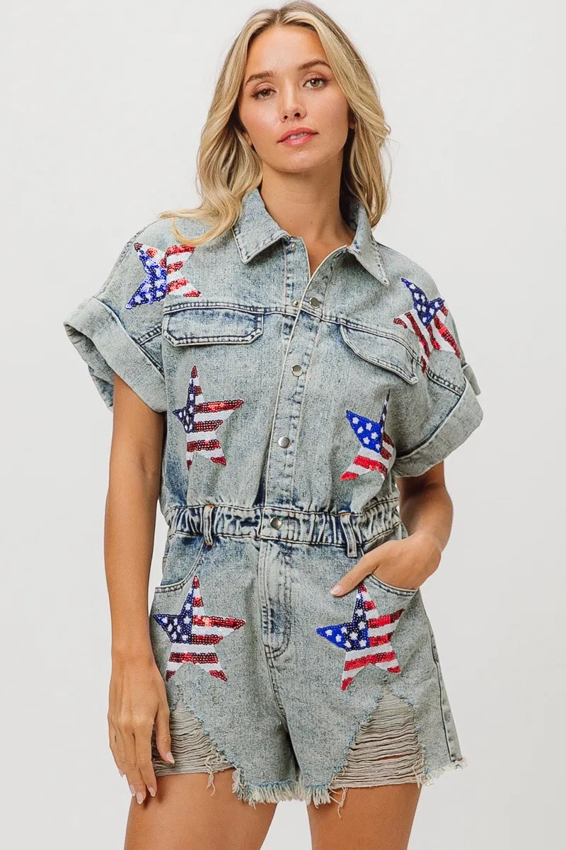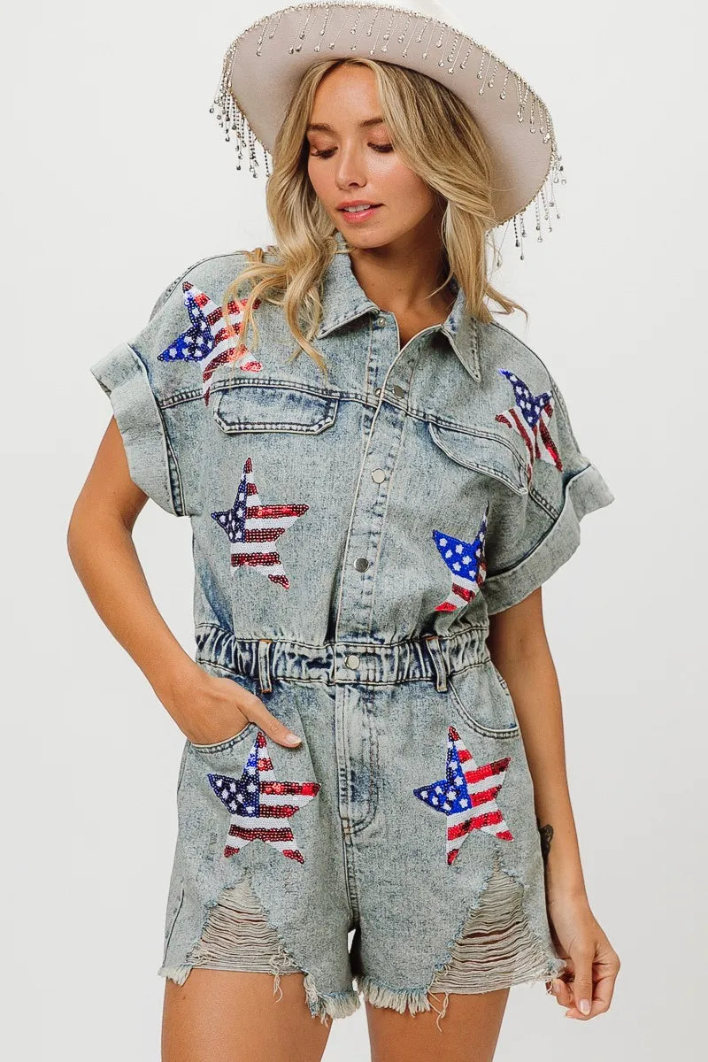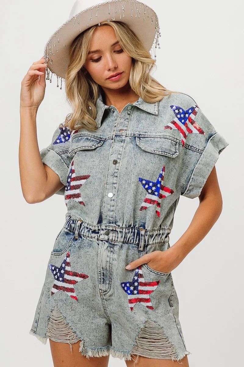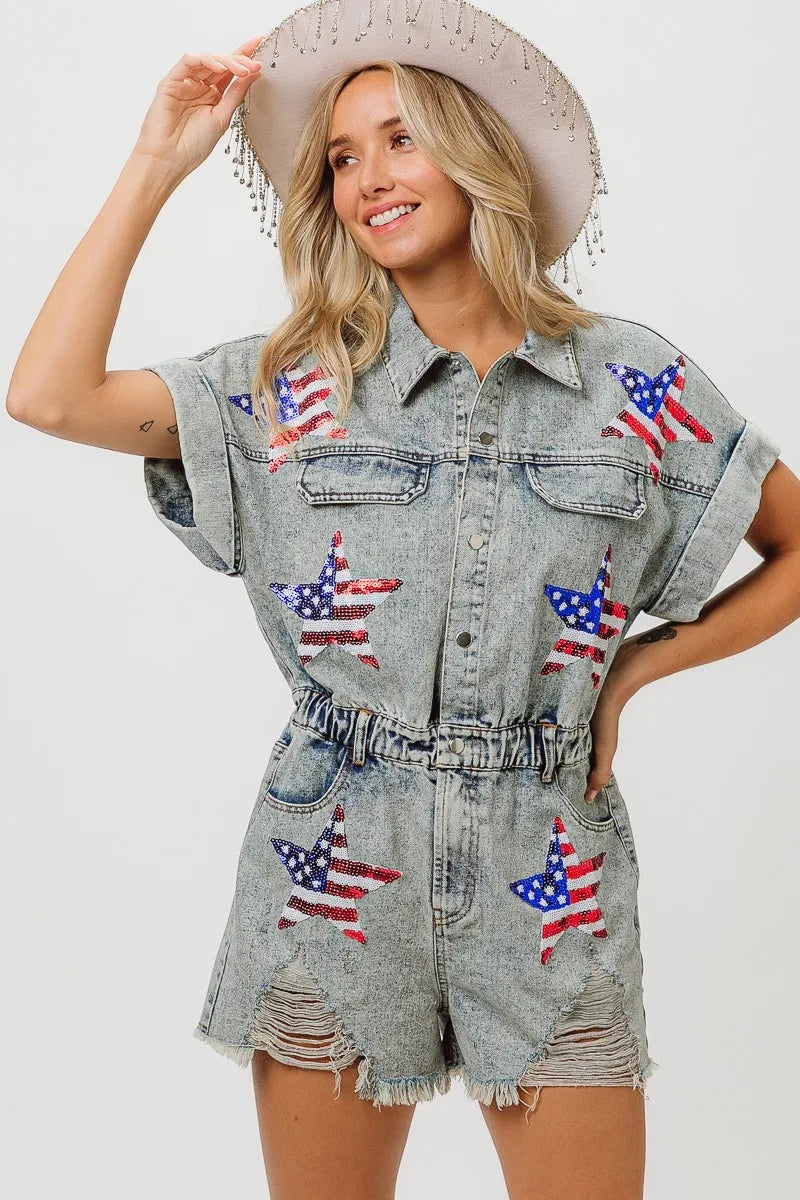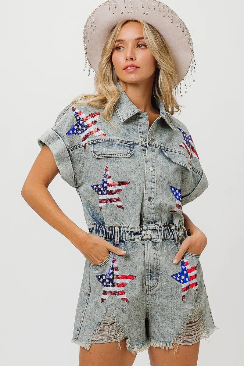 The American flag washed romper is a patriotic and trendy piece for your summer wardrobe. With the iconic stars and stripes design, it showcases your American pride in a stylish way. This romper is perfect for celebrating holidays like Independence Day or for adding a fun and festive touch to your summer outfits. Pair it with sneakers or sandals for a cute and casual look that's perfect for barbecues, picnics, or any summer festivities.