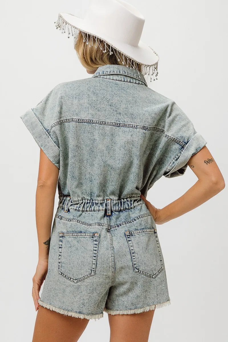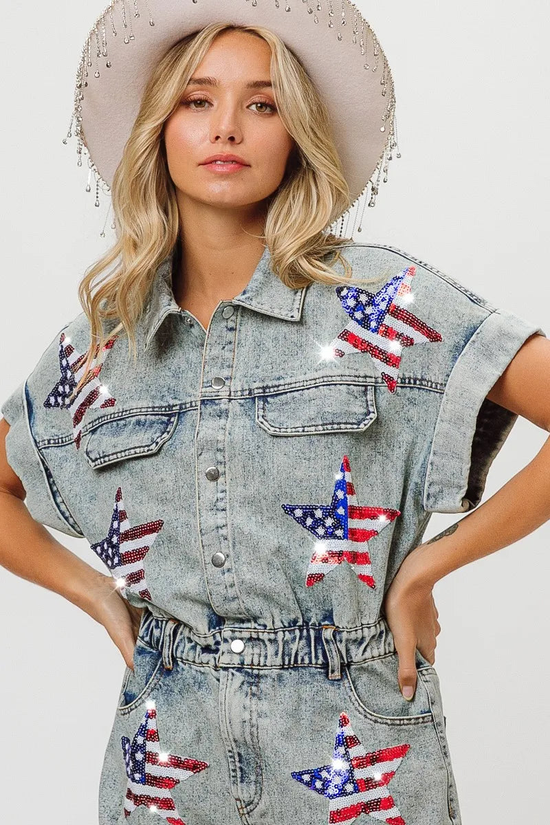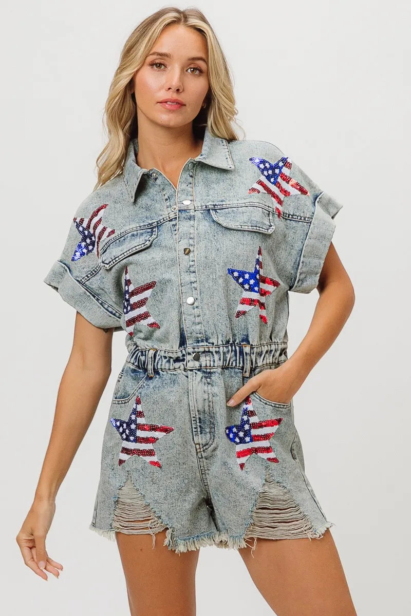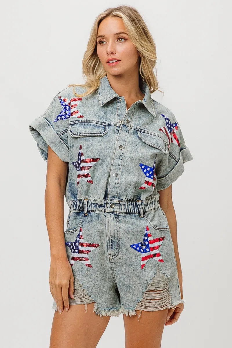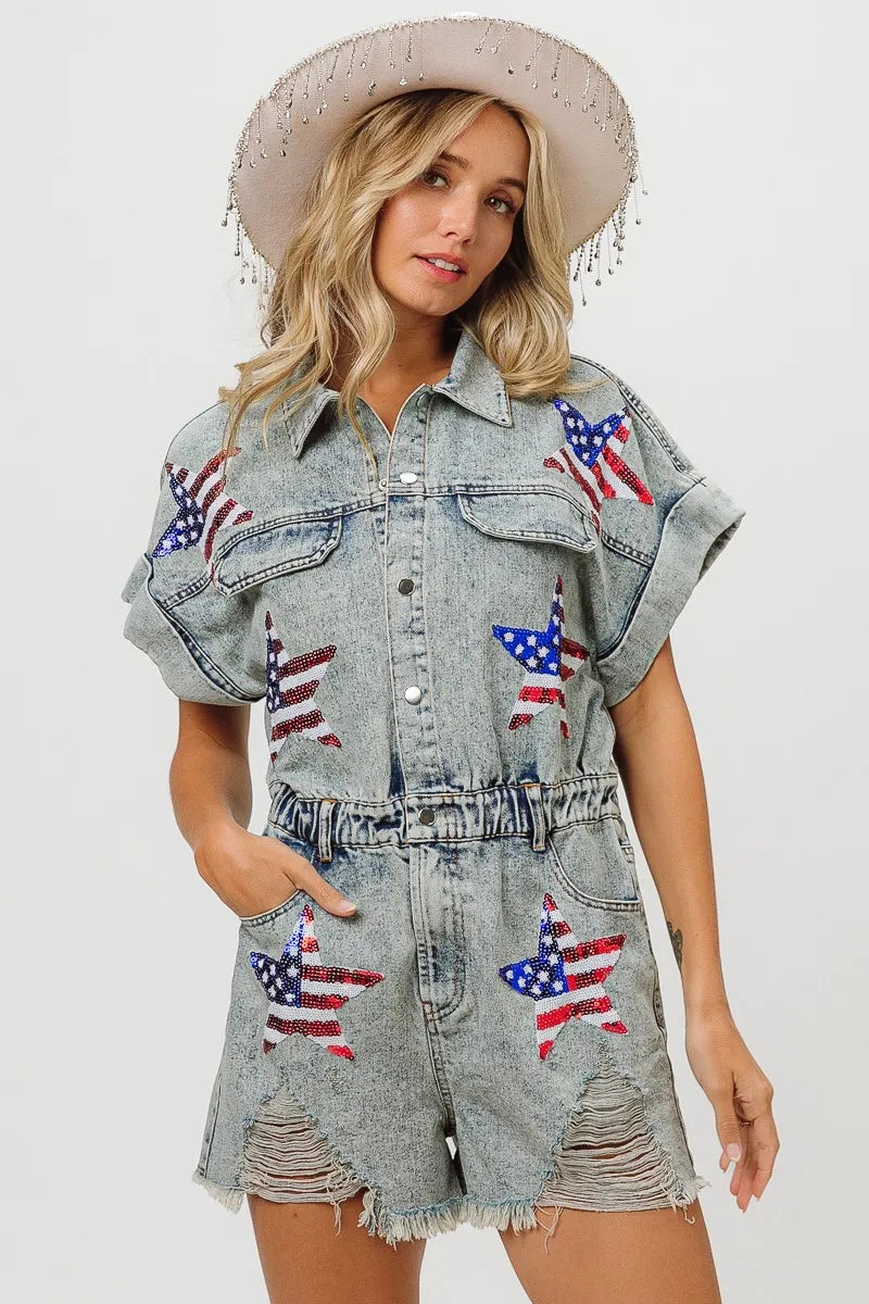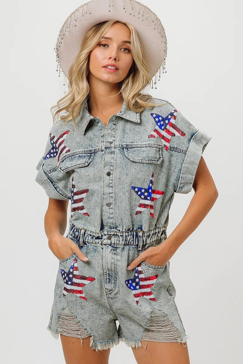 The American flag washed romper is a patriotic and trendy piece for your summer wardrobe. With the iconic stars and stripes design, it showcases your American pride in a stylish way. This romper is perfect for celebrating holidays like Independence Day or for adding a fun and festive touch to your summer outfits. Pair it with sneakers or sandals for a cute and casual look that's perfect for barbecues, picnics, or any summer festivities.