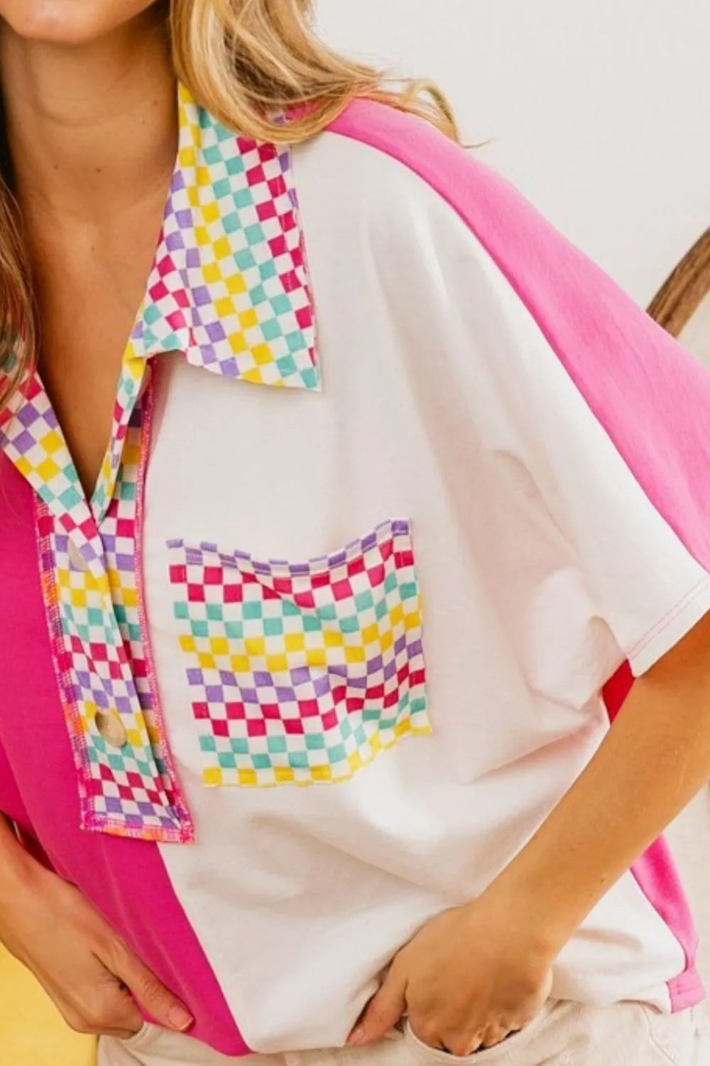 BiBi Color Block Knit with Multi Checker Contrast Top