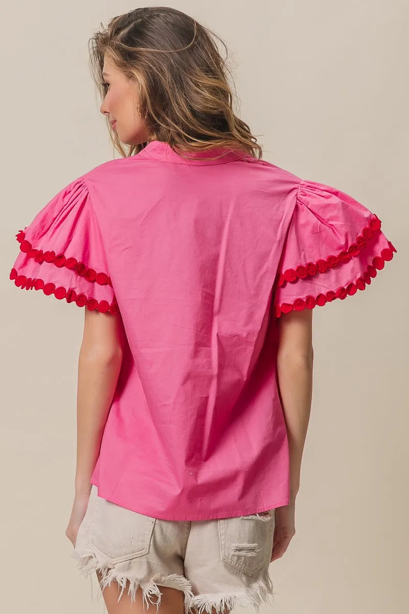 This stunning pink button-up blouse features eye-catching ruffle sleeves that add a playful feminine touch to any outfit. Made from comfortable cotton blend fabric, this shirt offers both style and comfort for everyday wear. The classic collar and button-down front provide a timeless silhouette, while the unique tiered ruffle sleeves create a fashion statement piece. Perfect for casual outings, work settings, or weekend activities. The vibrant pink color adds a pop of brightness to your wardrobe, and the relaxed fit ensures comfortable all-day wear. Easy to care for and versatile enough to pair with jeans, skirts, or dress pants.