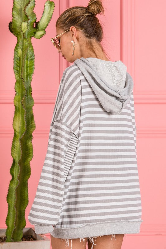 The Drawstring Striped Long Sleeve Hoodie with Kangaroo Pocket is a cozy and casual staple. Featuring stripes, long sleeves, and a hood with drawstrings, it offers a sporty look. The kangaroo pocket adds a practical element for storing essentials. Wear it with leggings or jeans for a relaxed and comfortable outfit, perfect for lounging or running errands.