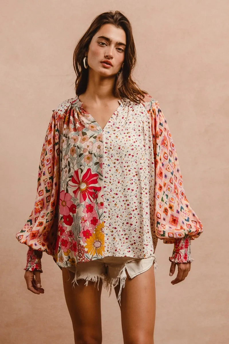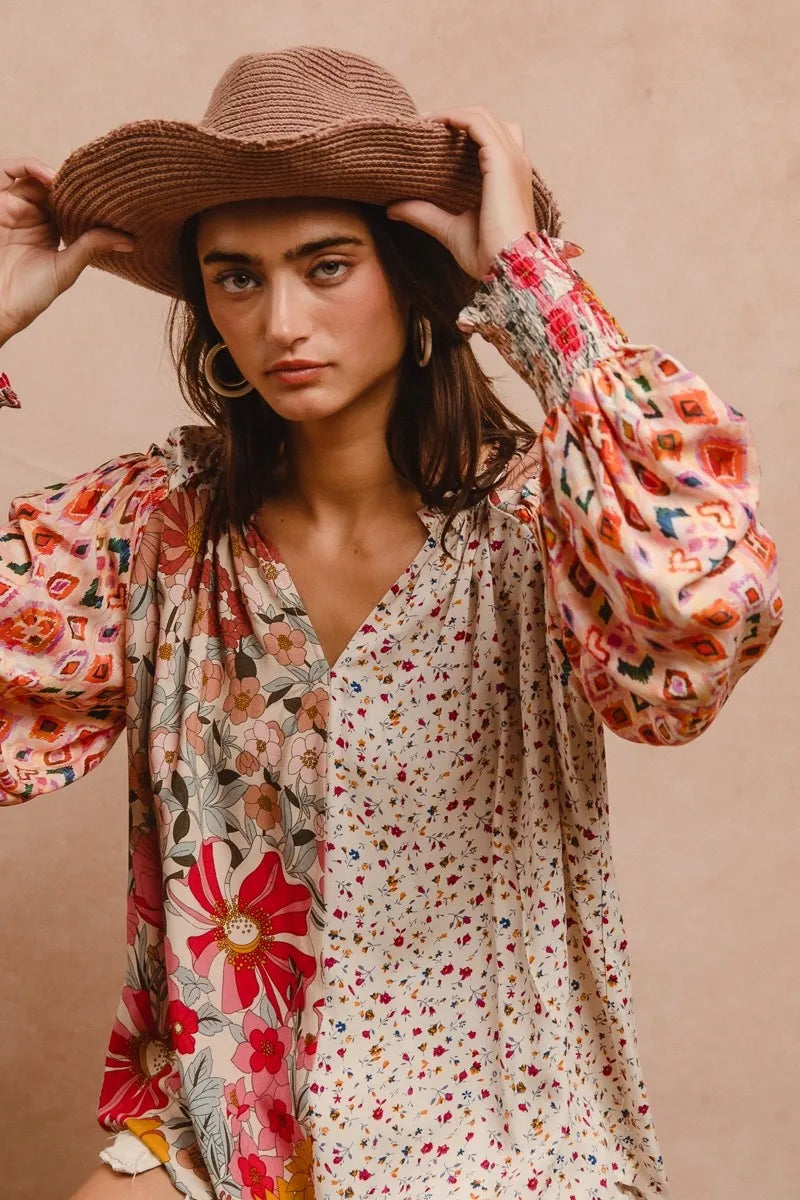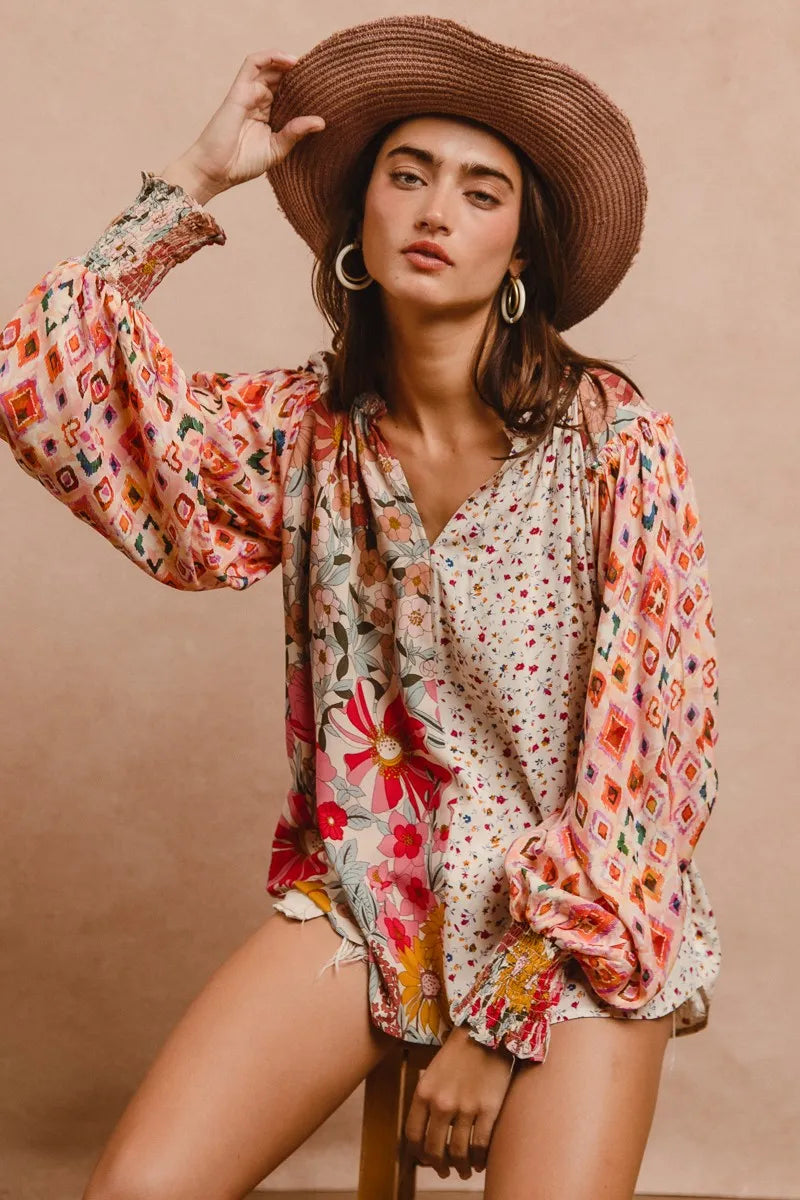 The Floral Print Mix and Match Long Sleeve Peasant Top is a trendy and versatile top with a bohemian vibe. It features a mix of floral prints that give it a unique and eclectic look. The peasant style typically includes a relaxed fit, loose sleeves, and often a gathered neckline or waist. This top is great for adding a touch of boho-chic to your outfit and can be easily paired with different bottoms for a variety of looks.
