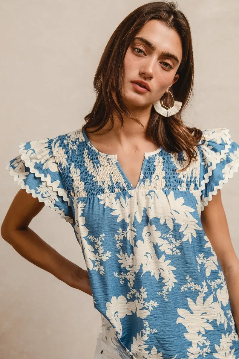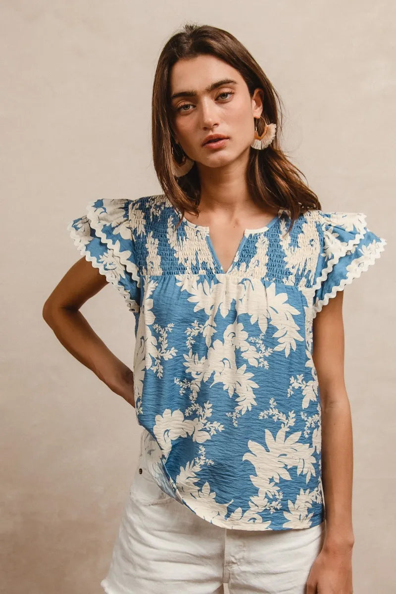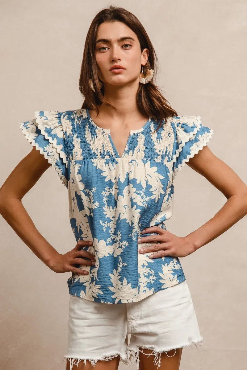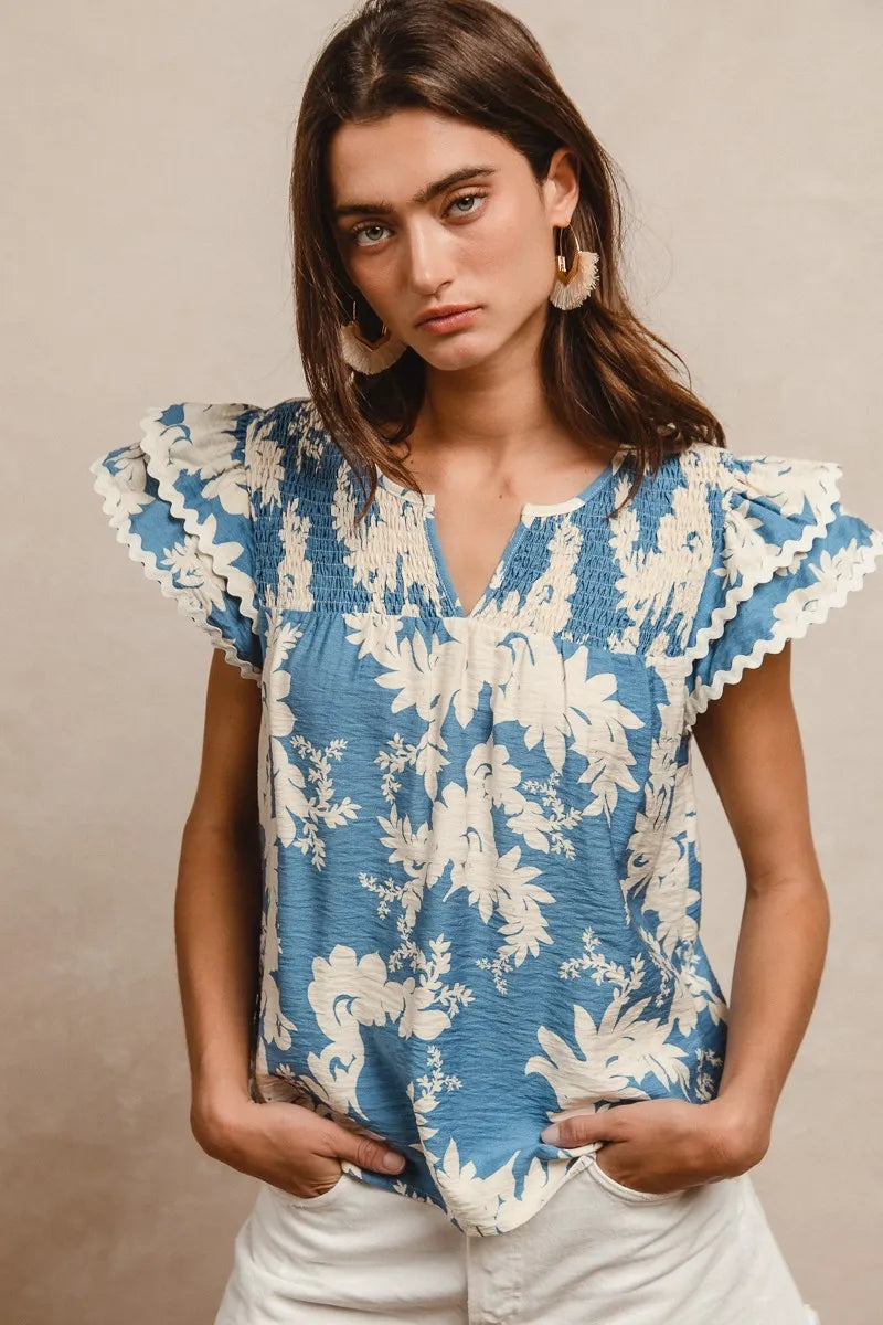 The Floral Prints Wave Trim Short Sleeve Blouse features charming floral prints and delicate smocking details. The wave trim adds a unique and eye-catching element to the blouse. This top is perfect for adding a touch of feminine elegance to your outfit.