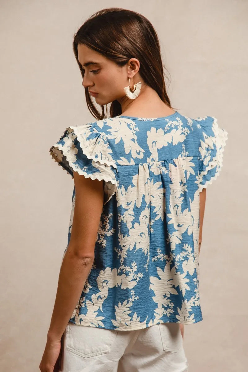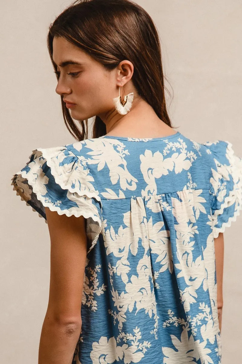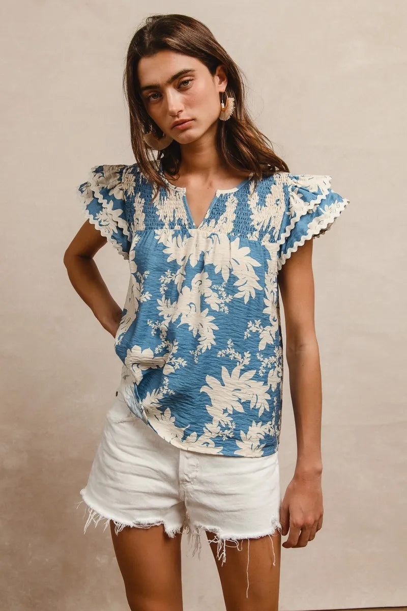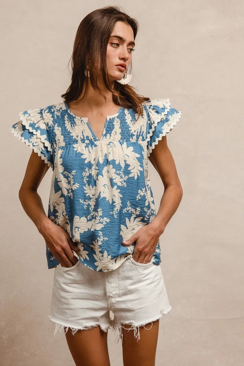 The Floral Prints Wave Trim Short Sleeve Blouse features charming floral prints and delicate smocking details. The wave trim adds a unique and eye-catching element to the blouse. This top is perfect for adding a touch of feminine elegance to your outfit.