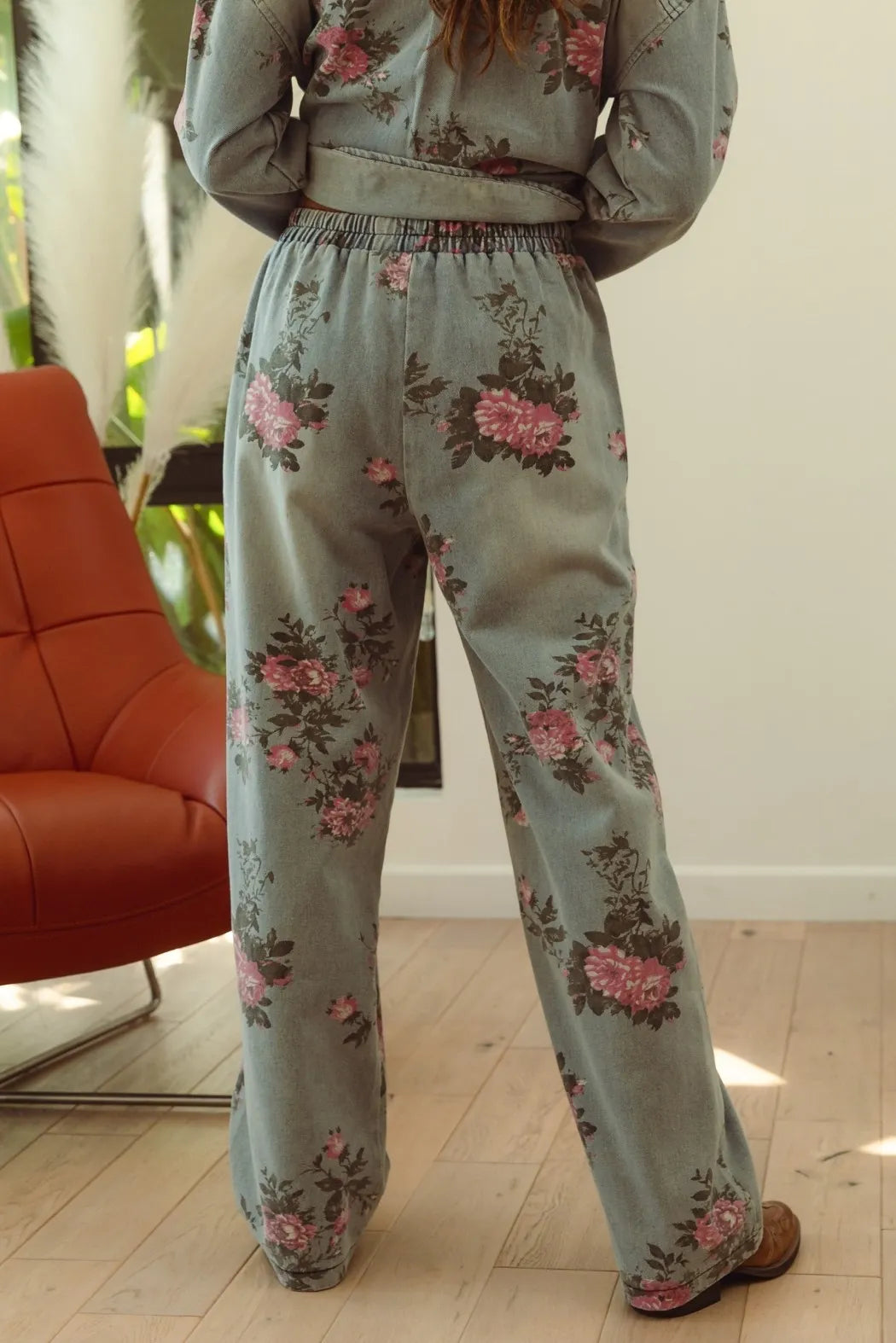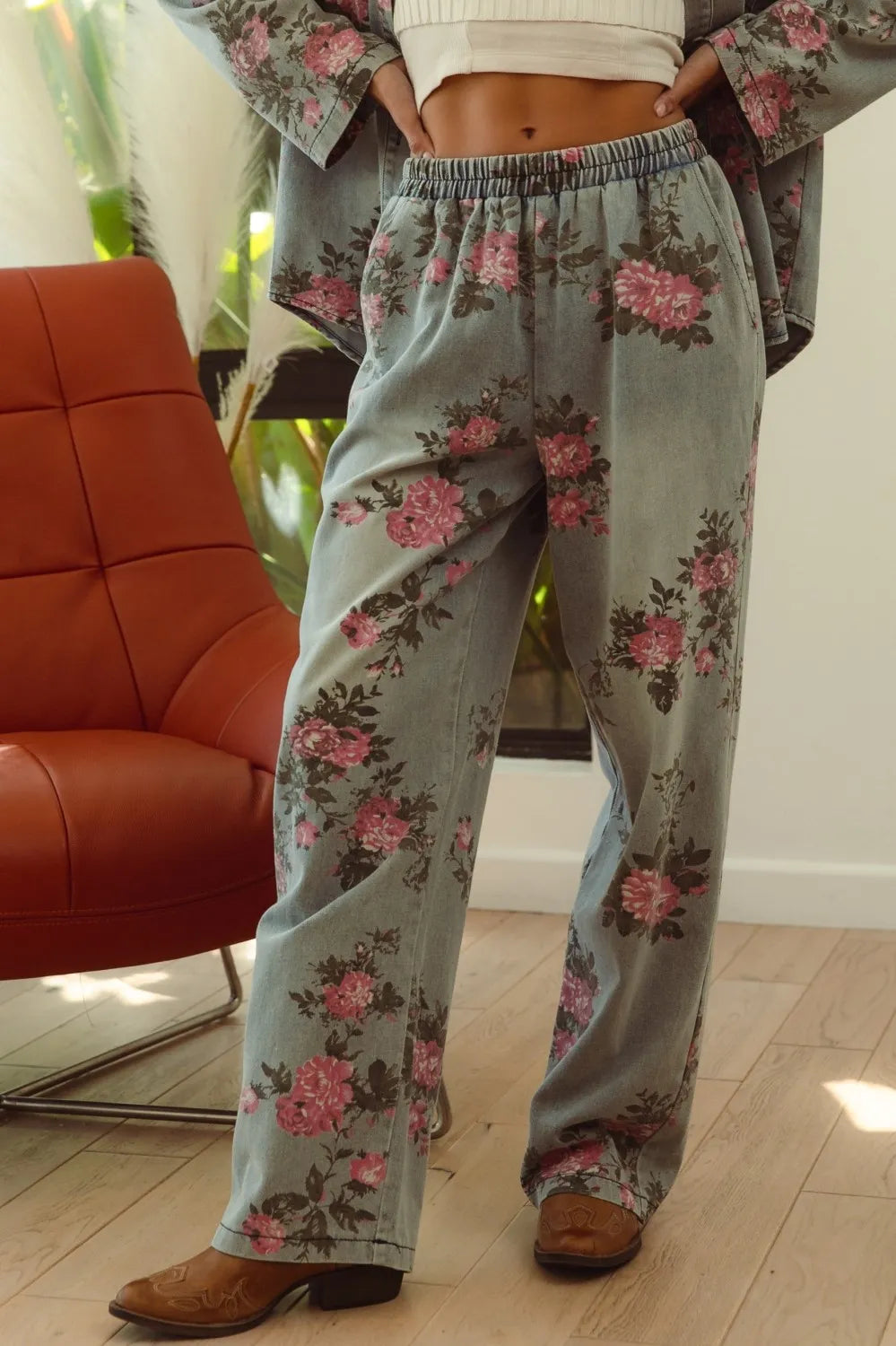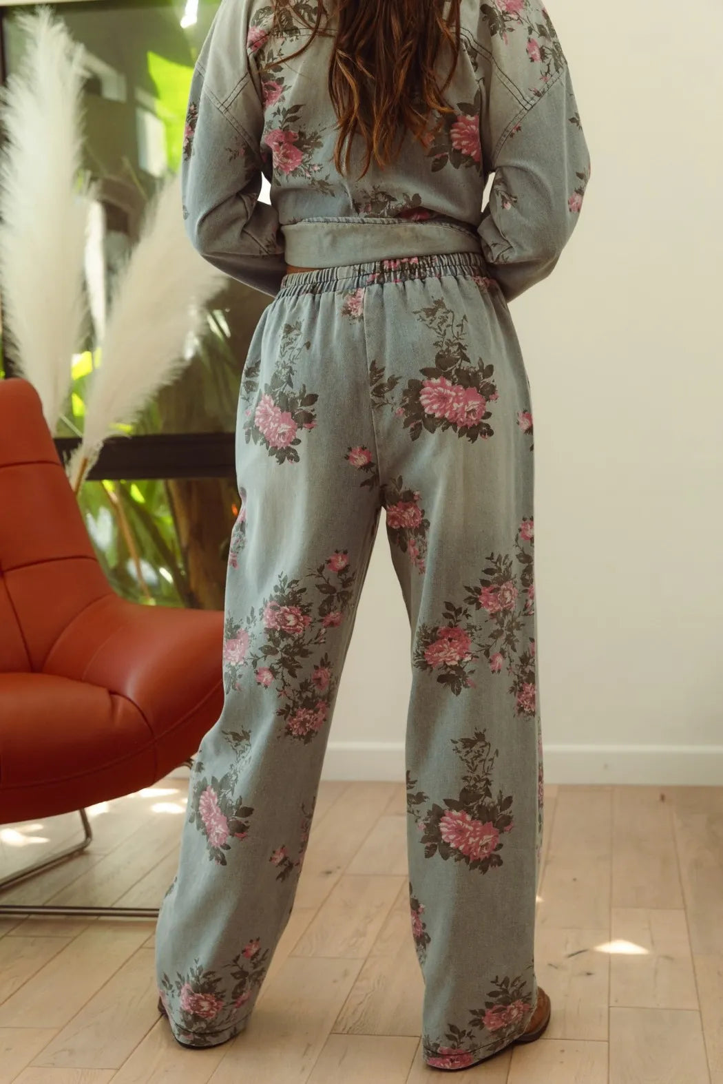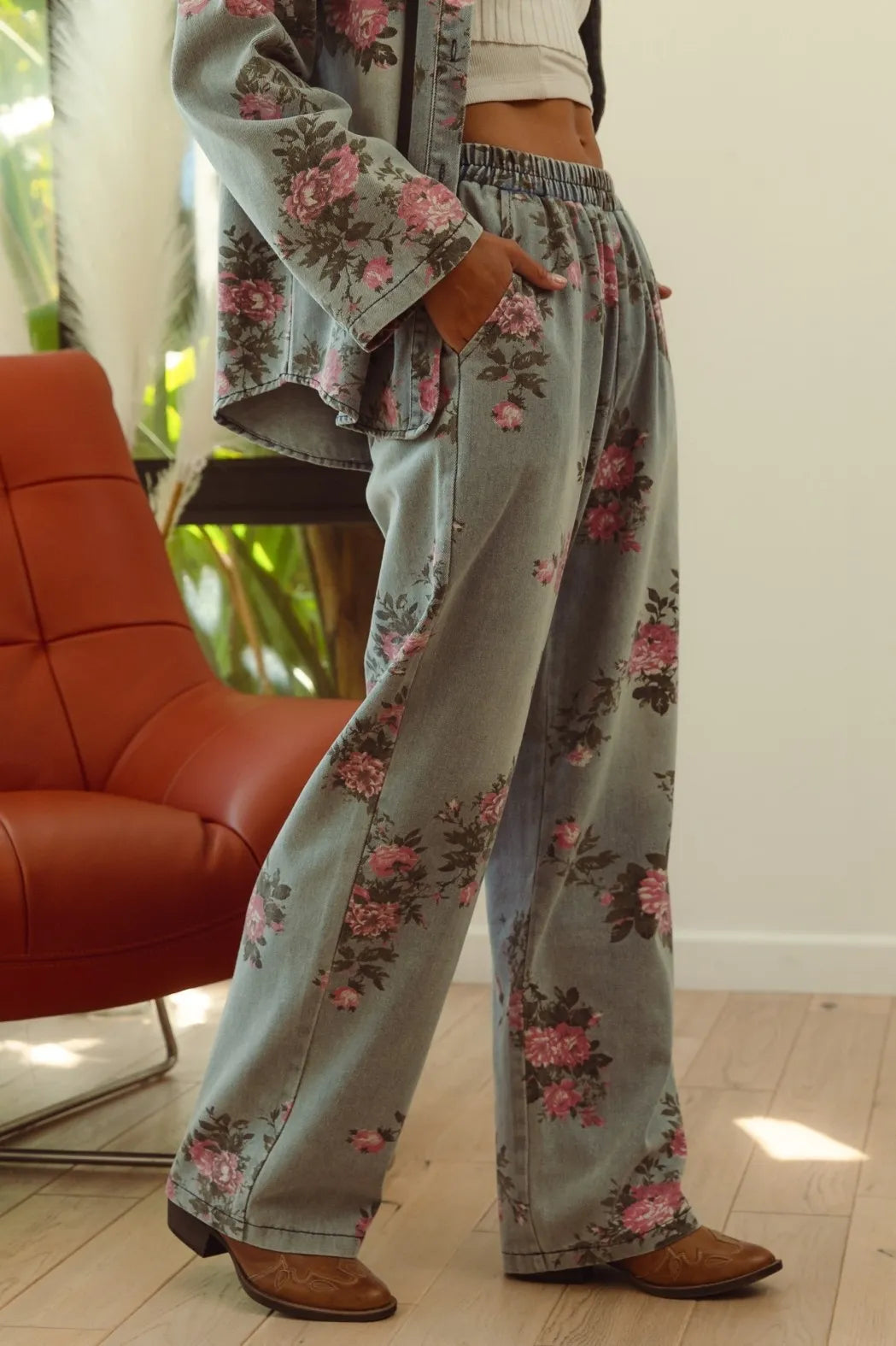 The flower printed denim pants are a vibrant and eye-catching addition to your wardrobe. With a colorful floral pattern scattered across the denim fabric, they exude a whimsical and playful charm. These pants offer a fun twist on classic denim and are perfect for making a statement with your outfit. Pair them with a solid top or a simple blouse to let the floral print take center stage, creating a fresh and stylish look that's perfect for any casual occasion.