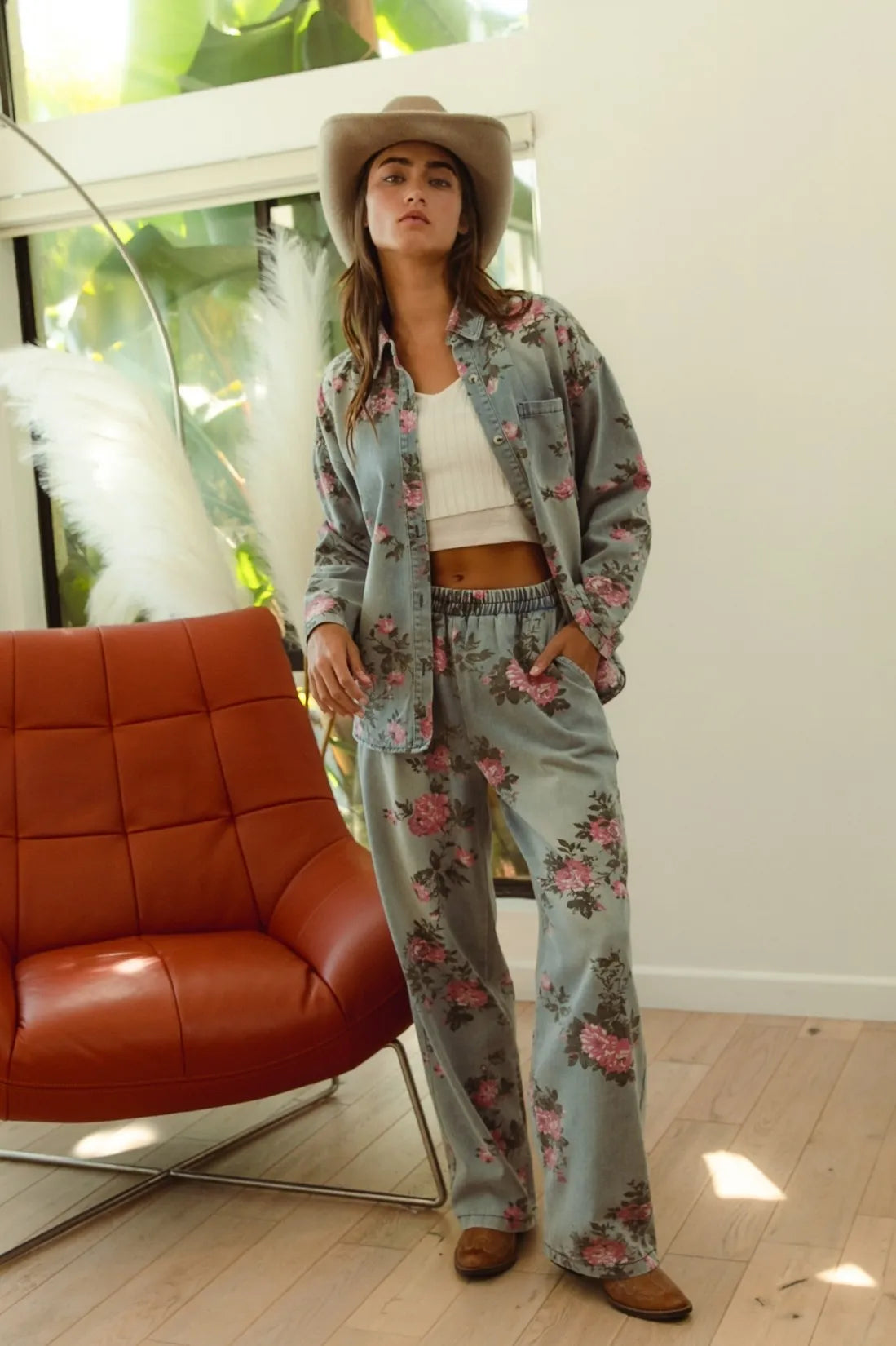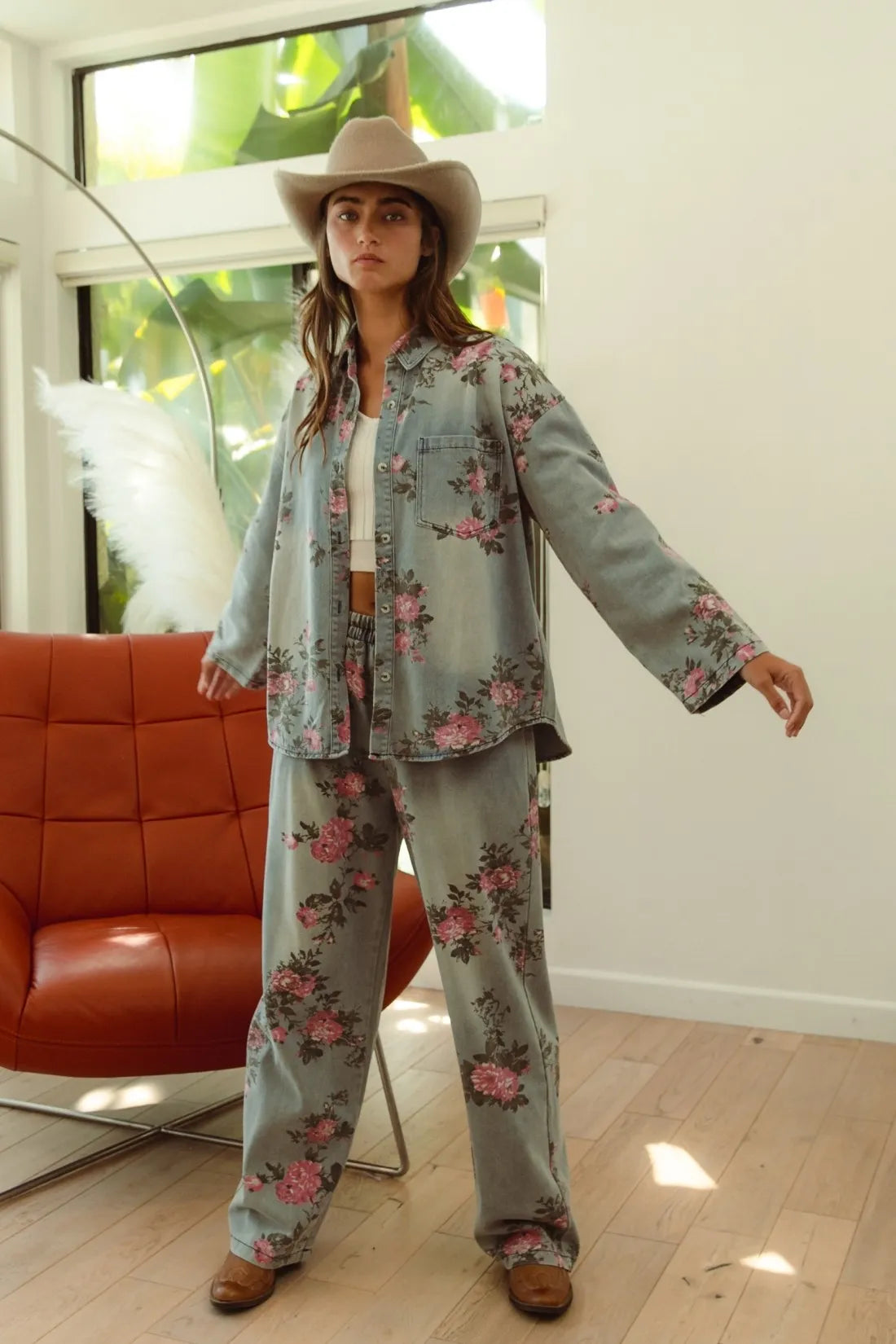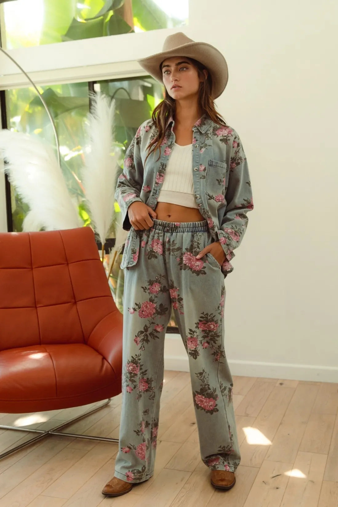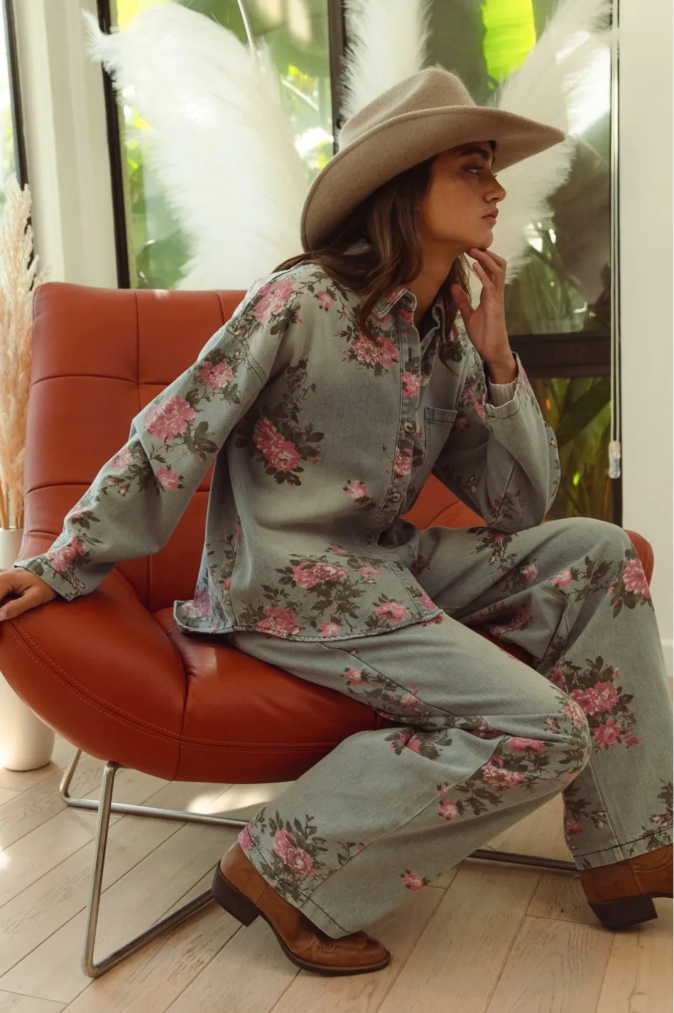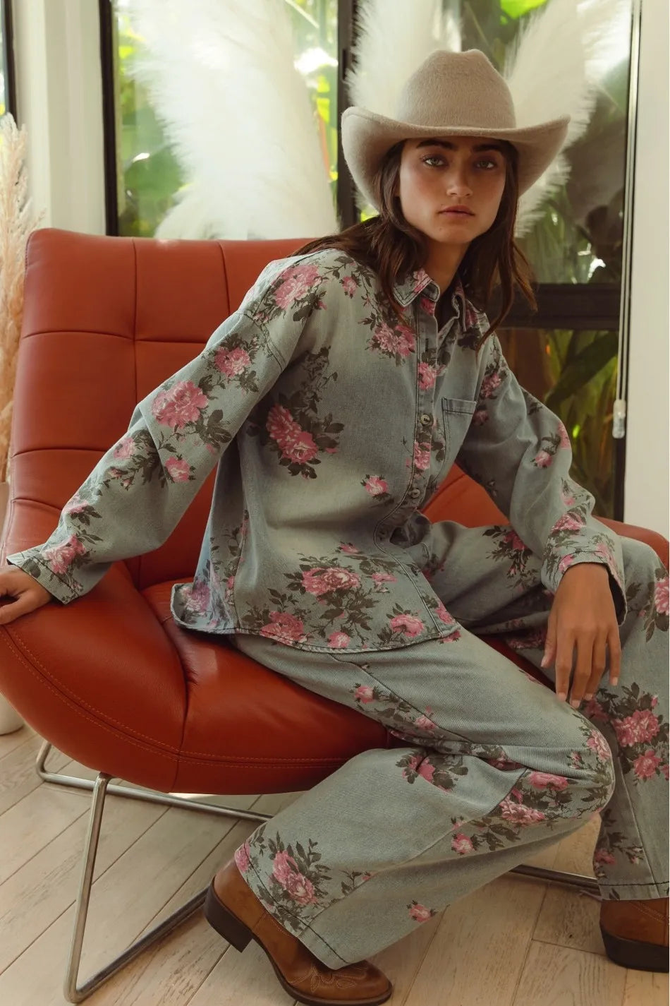The flower printed denim pants are a vibrant and eye-catching addition to your wardrobe. With a colorful floral pattern scattered across the denim fabric, they exude a whimsical and playful charm. These pants offer a fun twist on classic denim and are perfect for making a statement with your outfit. Pair them with a solid top or a simple blouse to let the floral print take center stage, creating a fresh and stylish look that's perfect for any casual occasion.