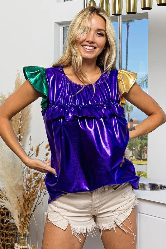 The Foiled Knit Color Block Short Sleeve Ruffled Top is a chic and modern piece that showcases a unique combination of color blocking and foil detailing. The short sleeves and ruffled accents add a feminine touch to the top, making it both stylish and versatile. The foil accents provide a touch of sparkle and shine, perfect for adding a touch of glamour to your outfit. The color block design adds visual interest and creates a fashion-forward look. Elevate your wardrobe with this trendy and eye-catching top that is sure to make a statement wherever you go!