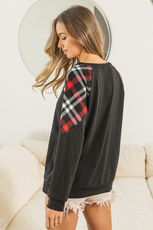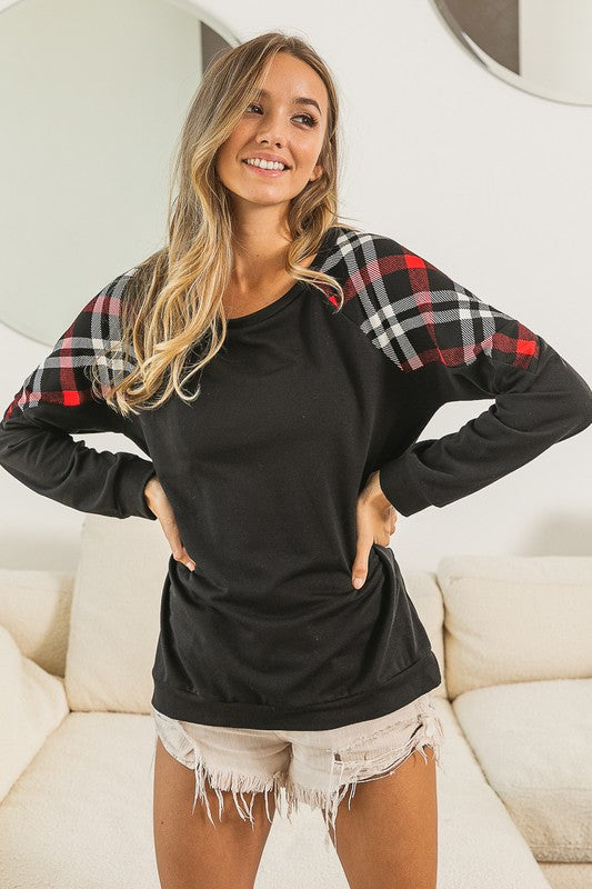 The French Terry Round Neck Plaid Shoulder Sweatshirt is a cozy and stylish top. This sweatshirt features a round neckline and plaid detailing on the shoulders, adding a trendy touch. Made from French terry fabric, it offers a comfortable and soft feel. Perfect for a casual and relaxed look, pair it with jeans or leggings for a chic outfit.
