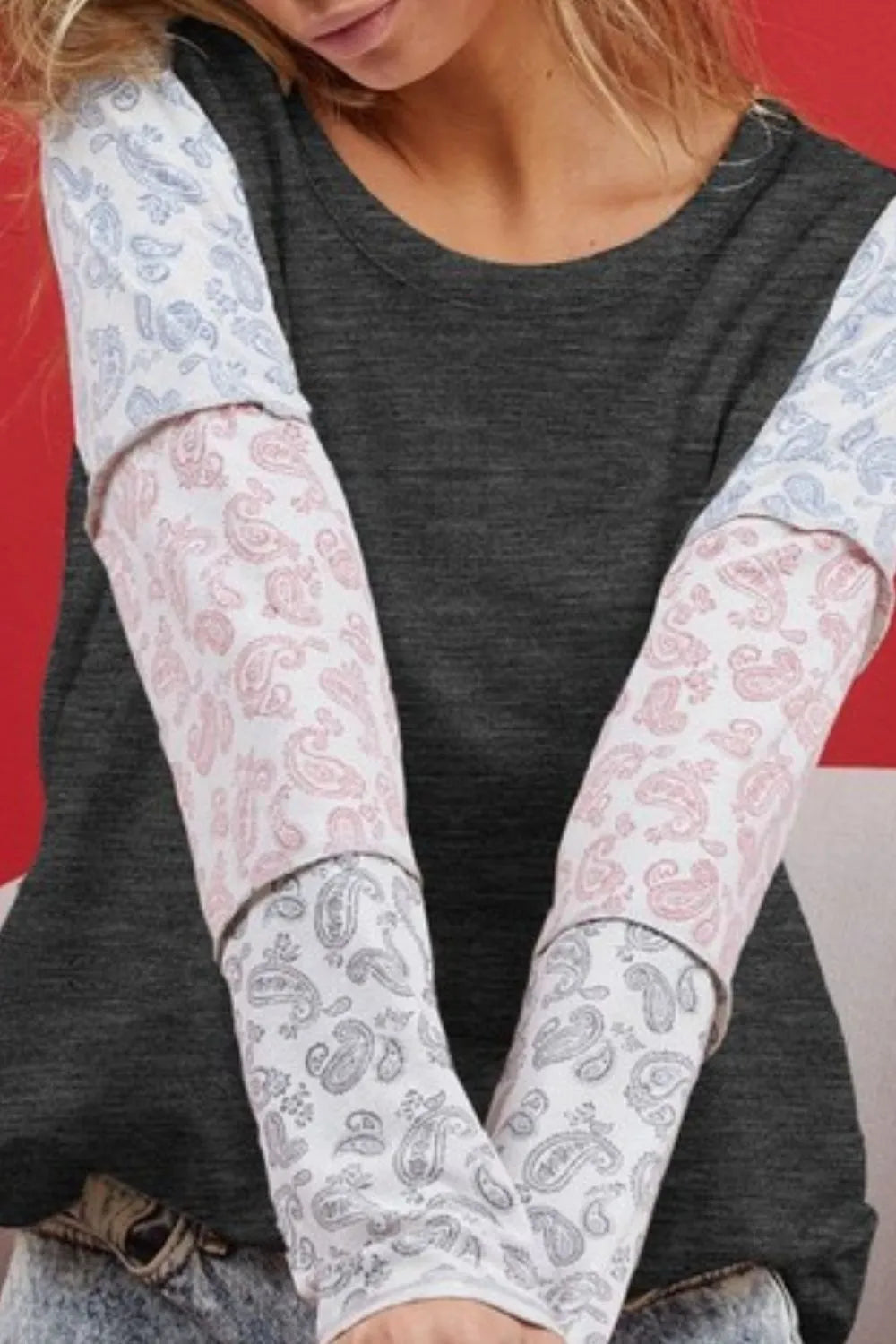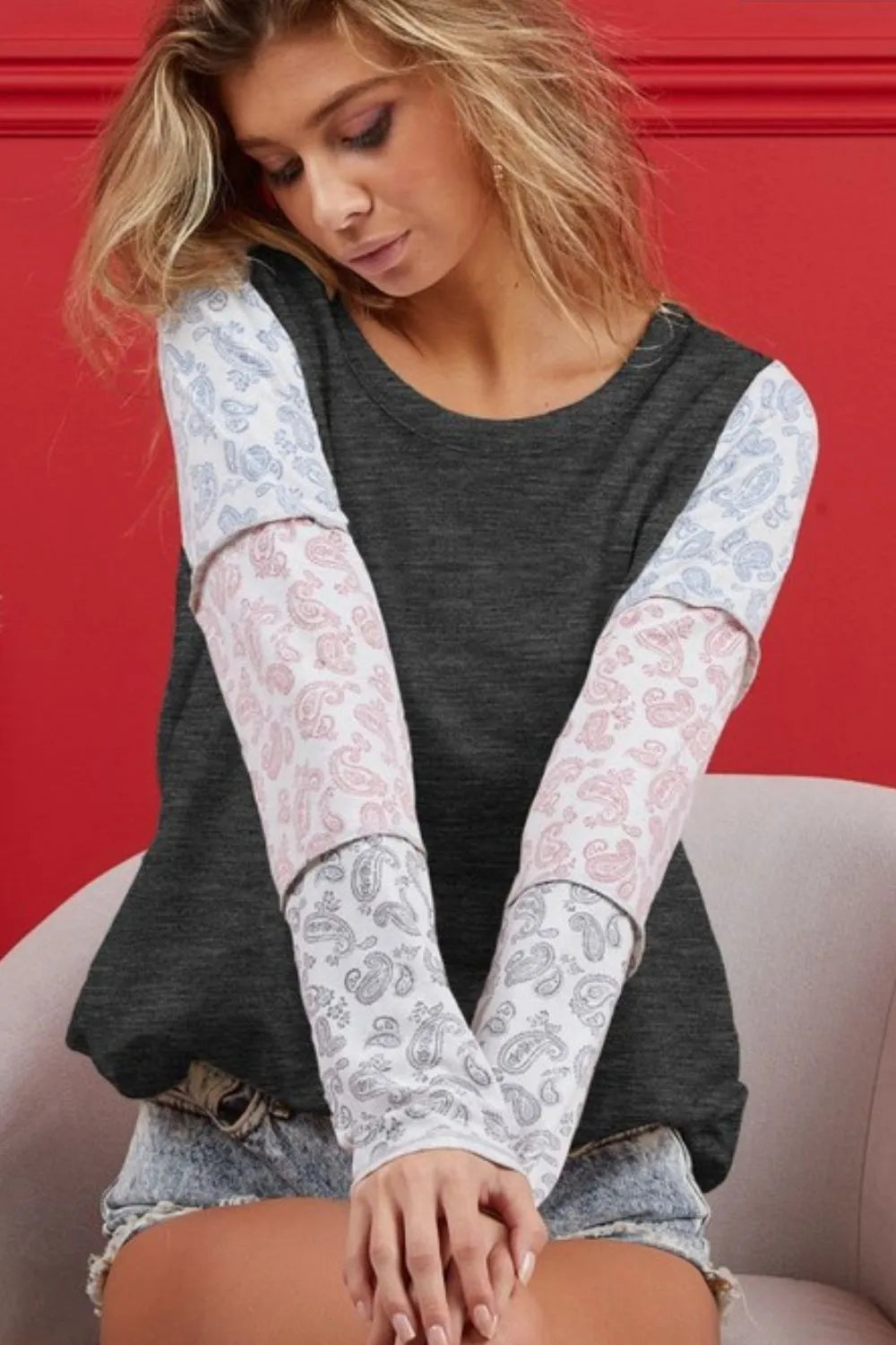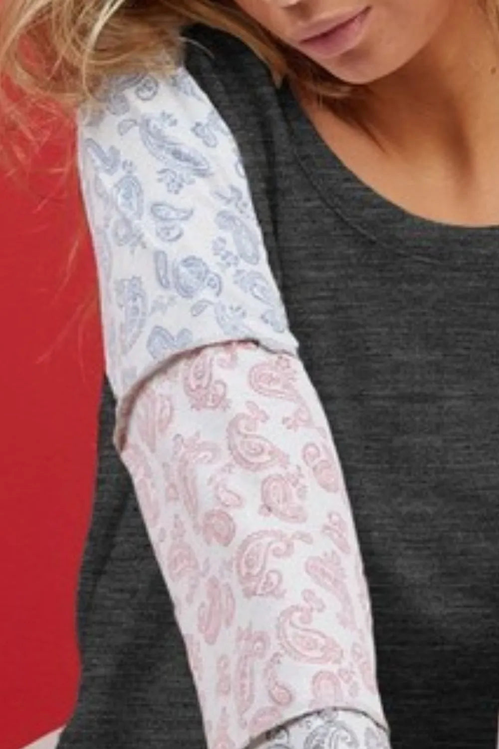 The French Terry with Paisley Triblend Color Block top combines different textures and patterns for a unique and stylish look. The French terry fabric provides a soft and comfortable feel, making it suitable for everyday wear. The paisley print adds a touch of bohemian flair, while the color block design creates a modern and interesting visual appeal. This top is versatile and can be dressed up or down depending on the occasion. Pair it with jeans for a casual outing or dress it up with a skirt for a more elevated look. The combination of French terry, paisley print, and color blocking makes this top a statement piece in any wardrobe.