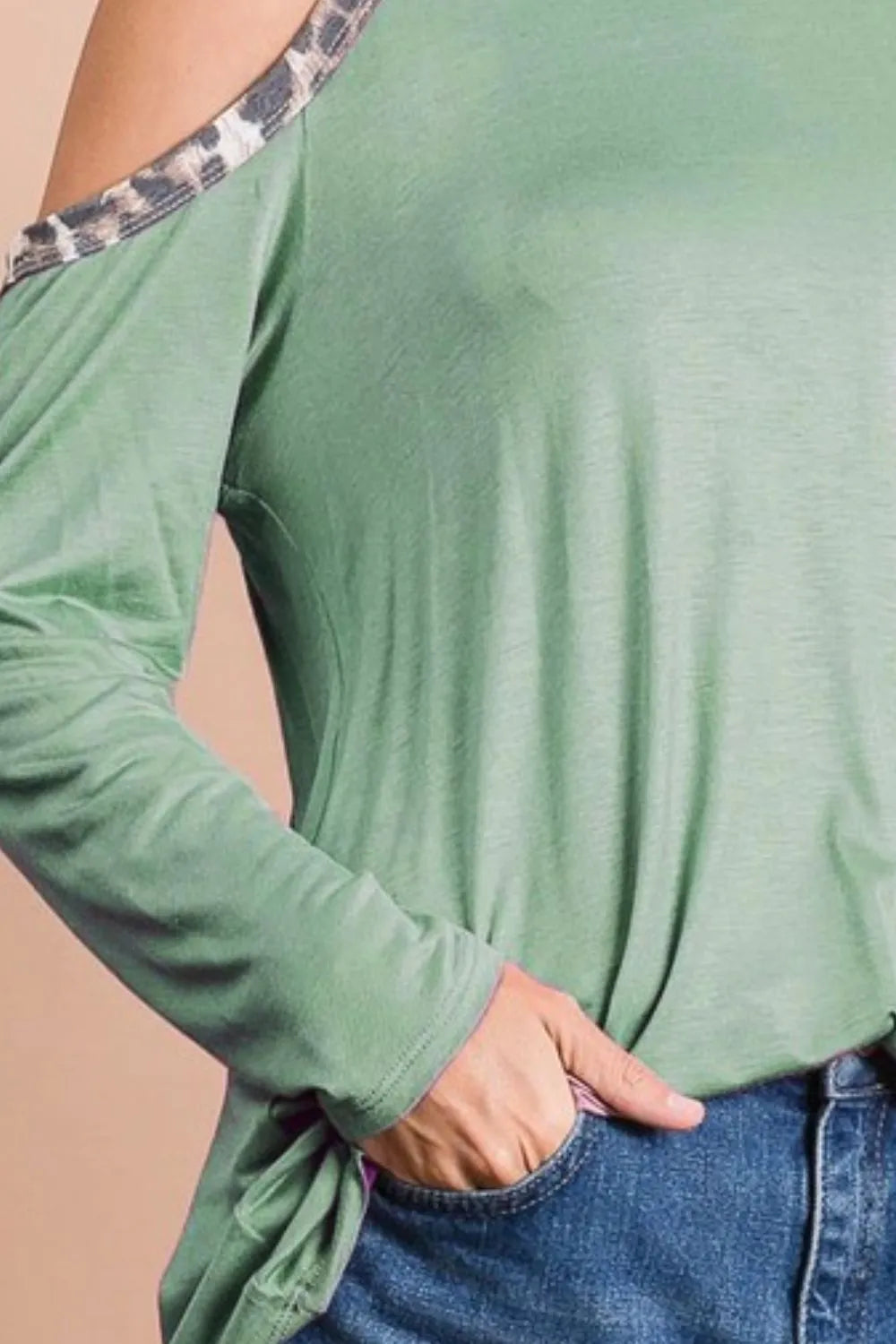 The Jersey Knit Cold Shoulder Top With Leopard Neck is a stylish garment made of jersey knit fabric, featuring a cold shoulder design and a leopard print neckline. This top combines fashion and comfort, with the cold shoulder design adding a trendy touch and the leopard print neckline adding a pop of interest. Pair it with jeans or a skirt to create a chic and casual look.