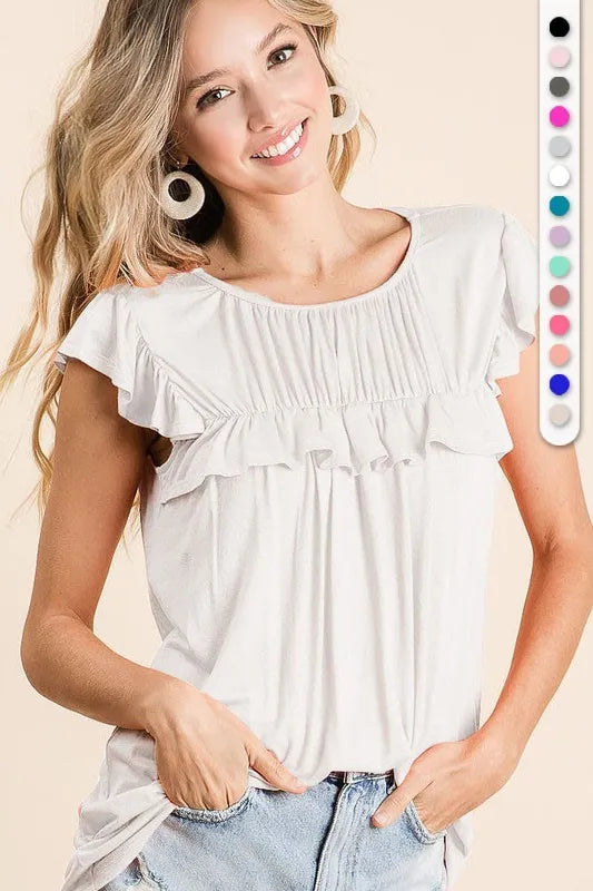 The Jersey Knit Gathered Top with Ruffles is a feminine and stylish piece that combines comfort with a touch of elegance. The jersey knit fabric offers a soft and stretchy feel, making it comfortable for all-day wear. The gathered detailing adds texture and visual interest to the top, creating a flattering silhouette. The ruffles accentuate the neckline or sleeves, adding a playful and romantic touch to the design. This top can be dressed up with a skirt or dress pants for a polished look, or paired with jeans for a more casual vibe. The combination of jersey knit fabric, gathered detailing, and ruffles makes this top a versatile and chic addition to your wardrobe.