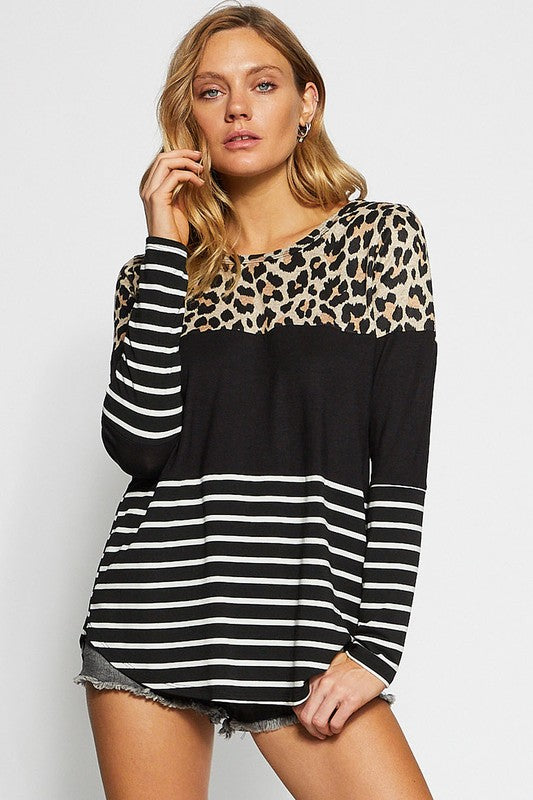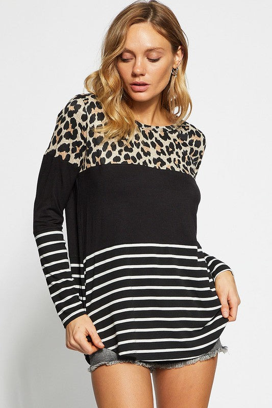 The Leopard Striped Round Neck Long Sleeve T-Shirt is a trendy and eye-catching top. Featuring a combination of leopard print and stripes, this shirt offers a stylish and bold look. The round neckline and long sleeves add a classic touch to the design. Perfect for casual outings or everyday wear, this t-shirt combines fun patterns with a comfortable fit for a fashionable ensemble.
