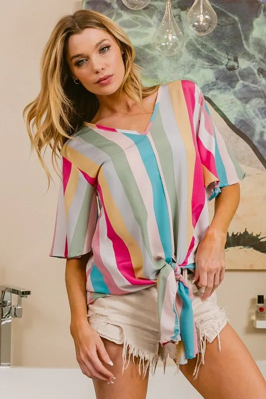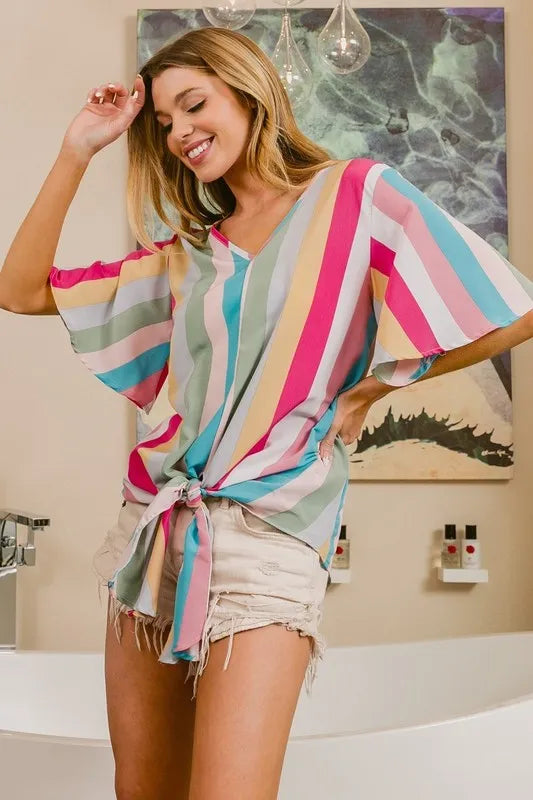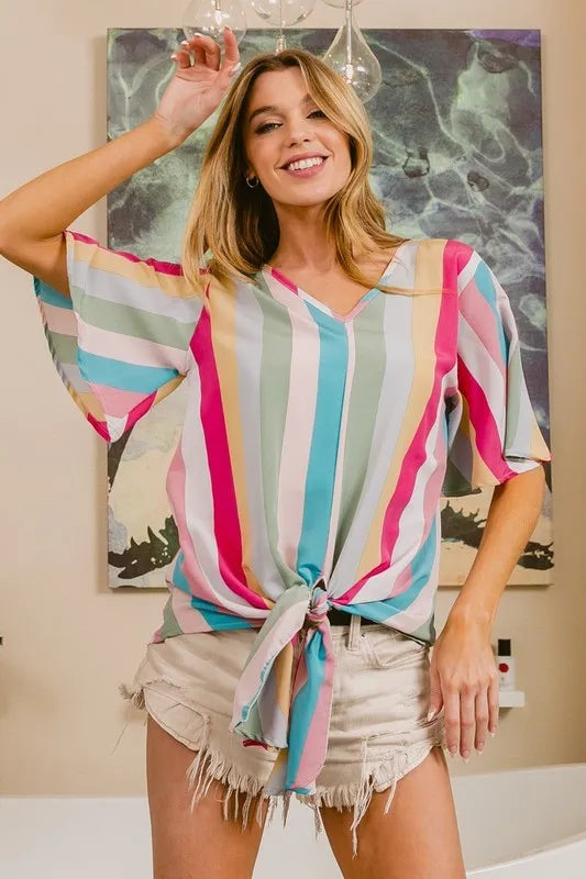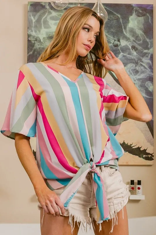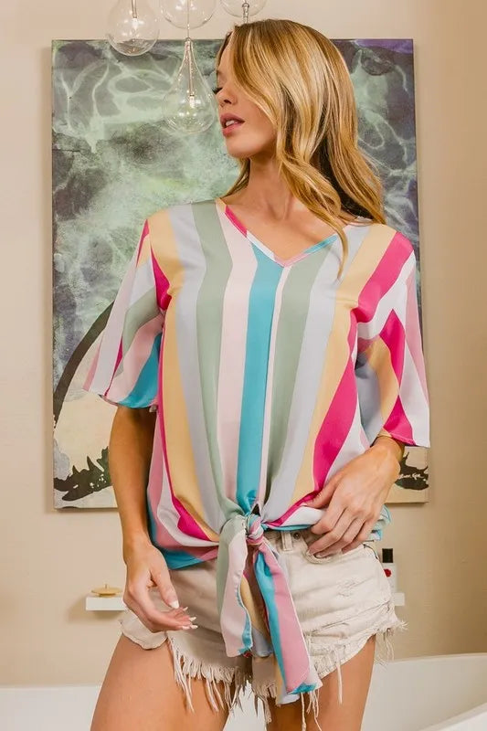 This multi stripe woven V-neck top with a long front tie is a stylish and versatile addition to your wardrobe. The V-neck design adds a flattering touch to this top, while the long front tie detail adds a trendy and eye-catching element. The multi stripe pattern gives this top a fun and playful look, perfect for both casual and dressy occasions. Pair it with your favorite jeans for a relaxed everyday outfit, or dress it up with tailored pants for a more polished look. Embrace the comfort and style of this top for a chic and effortless outfit choice.