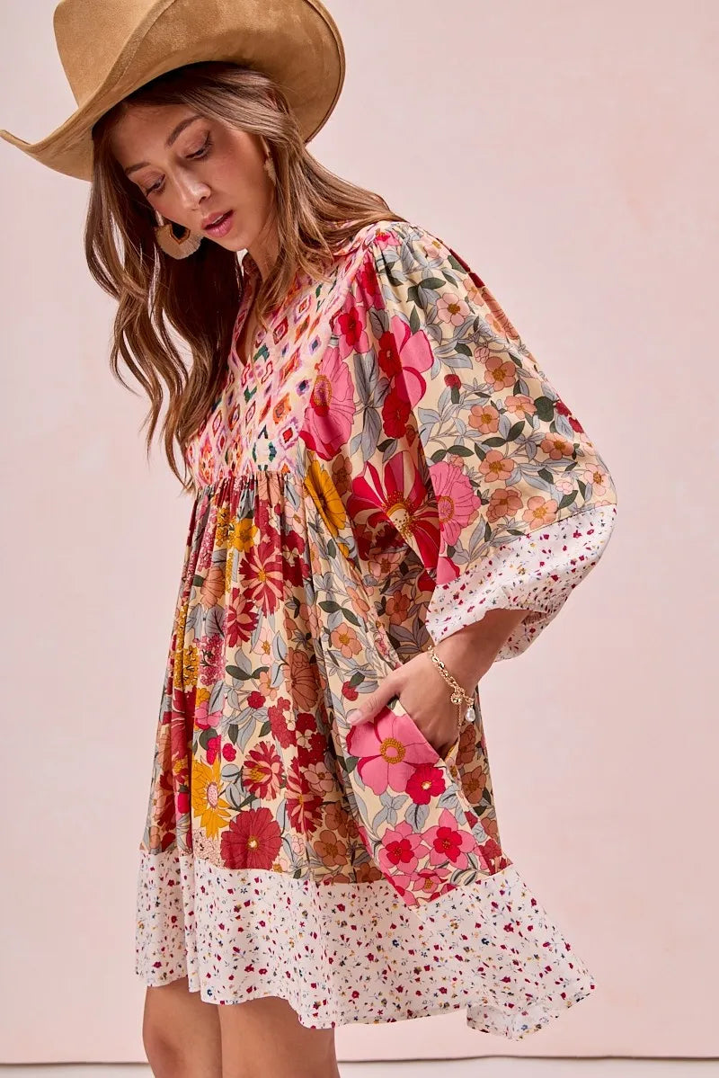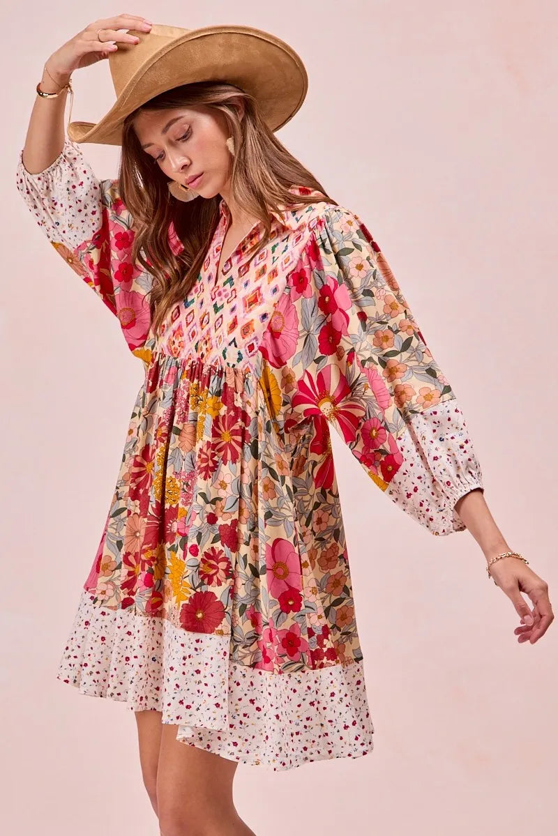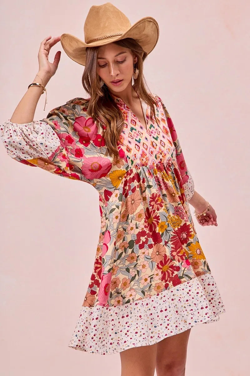 This stunning bohemian-inspired dress features a captivating mix of floral and geometric patchwork prints that create a vibrant, eye-catching design. Crafted from lightweight, flowing fabric, this dress offers ultimate comfort with its relaxed empire waist silhouette that flatters all body types. The three-quarter sleeves and knee-length cut make it perfect for transitional seasons, while the eclectic print combination showcases roses, geometric patterns, and polka dots in warm tones of pink, coral, yellow, and cream. The dress embodies effortless boho-chic style, making it ideal for casual outings, festivals, or vacation wear. The mixed-media print design ensures this piece stands out as a unique fashion statement that combines vintage charm with contemporary appeal.