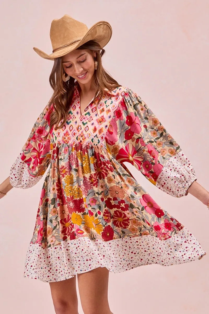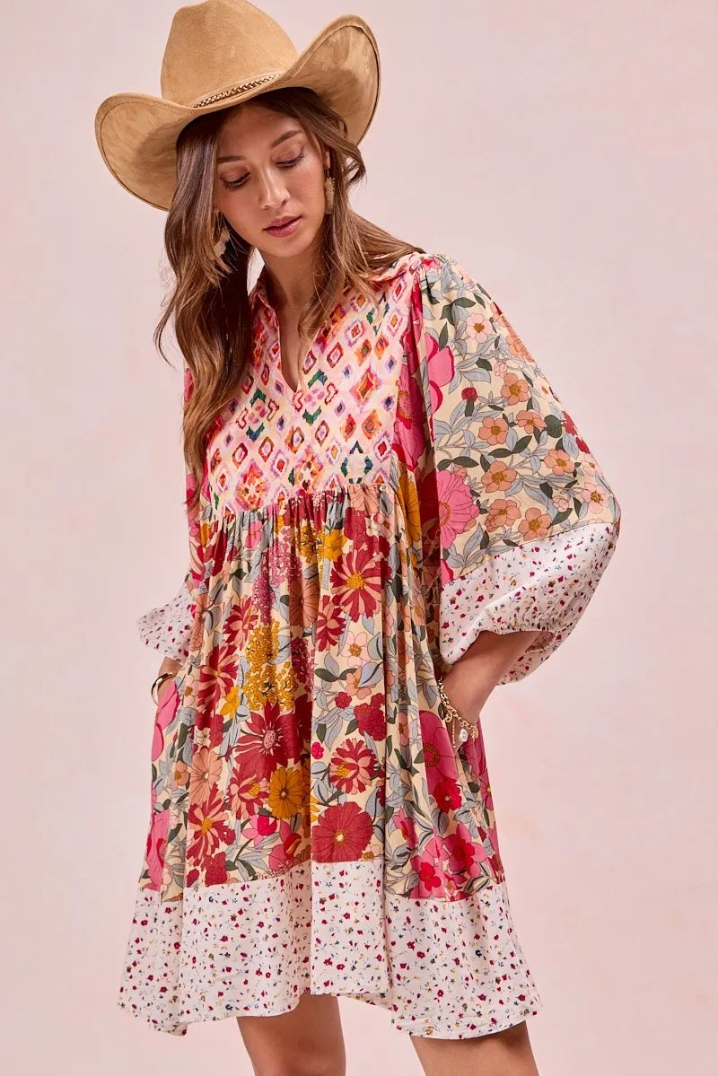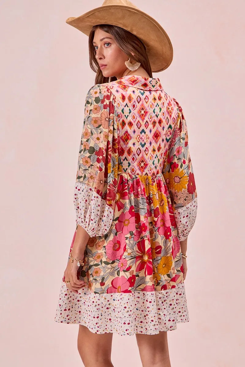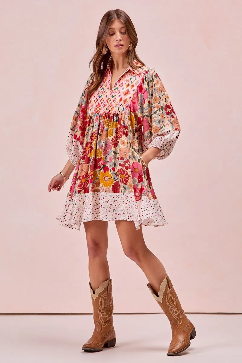 This stunning bohemian-inspired dress features a captivating mix of floral and geometric patchwork prints that create a vibrant, eye-catching design. Crafted from lightweight, flowing fabric, this dress offers ultimate comfort with its relaxed empire waist silhouette that flatters all body types. The three-quarter sleeves and knee-length cut make it perfect for transitional seasons, while the eclectic print combination showcases roses, geometric patterns, and polka dots in warm tones of pink, coral, yellow, and cream. The dress embodies effortless boho-chic style, making it ideal for casual outings, festivals, or vacation wear. The mixed-media print design ensures this piece stands out as a unique fashion statement that combines vintage charm with contemporary appeal.