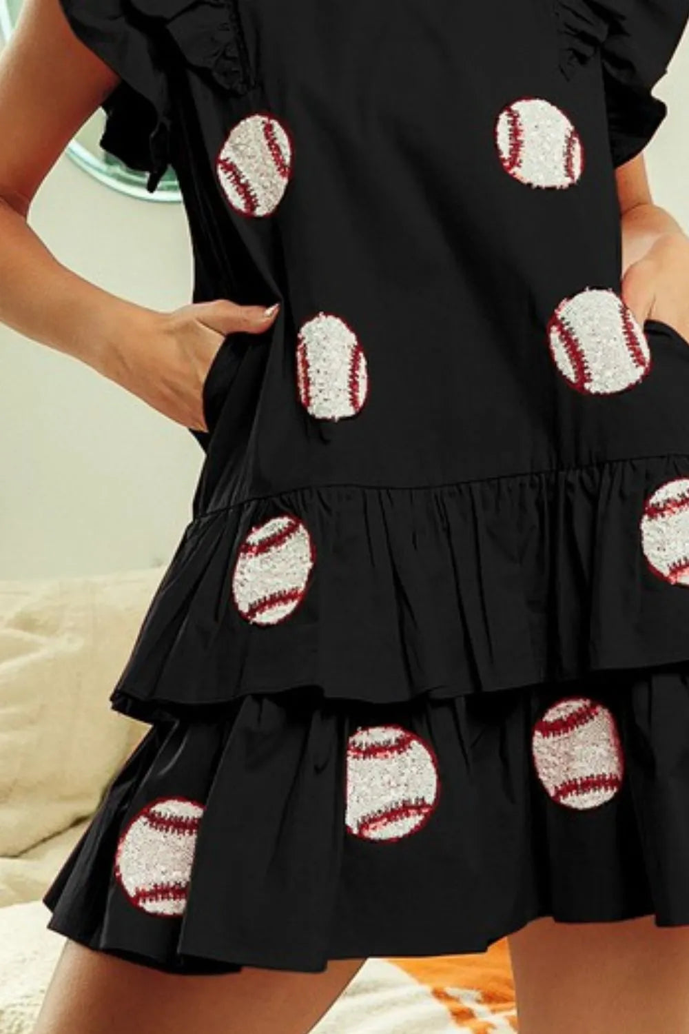 This Sequins Baseball Patch Gameday Dress is a fun and trendy choice for sports fans. With its sequin embellishments and baseball patch detail, it adds a touch of sparkle and team spirit to your wardrobe. Perfect for gameday or any casual outing, this dress is sure to make a statement!