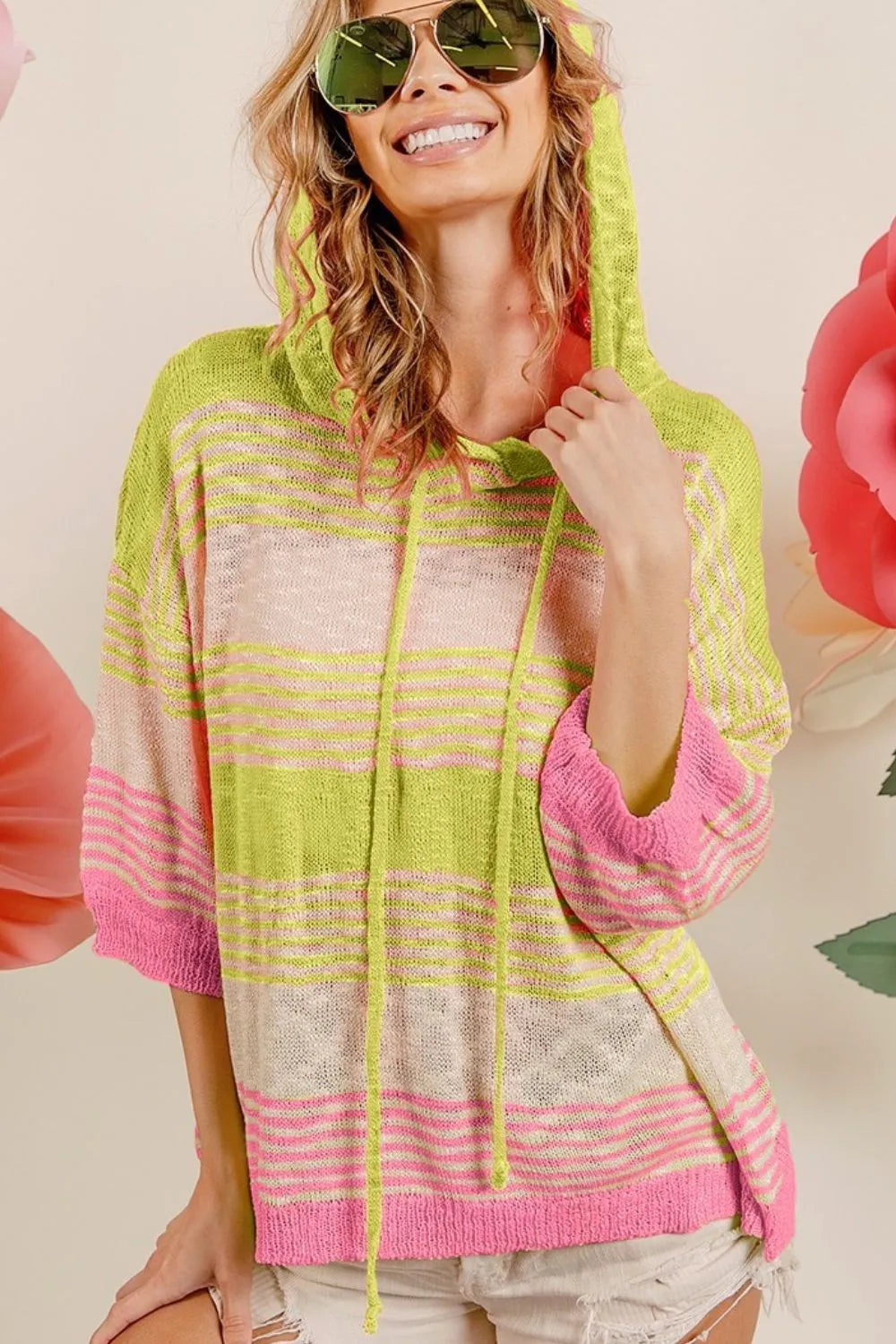 The short sleeve stripe low gauge knit hoodie is a versatile and comfortable addition to your wardrobe. The striped pattern adds a classic and timeless touch to the hoodie. The low gauge knit fabric offers a lightweight and breathable feel, making it perfect for layering in transitional weather. The short sleeves provide a relaxed and casual look, ideal for everyday wear. Elevate your style with the short sleeve stripe low gauge knit hoodie for a laid-back and stylish ensemble.