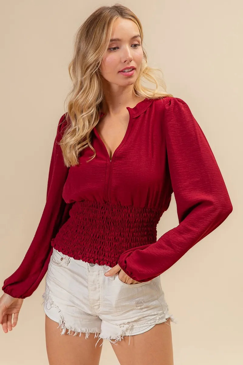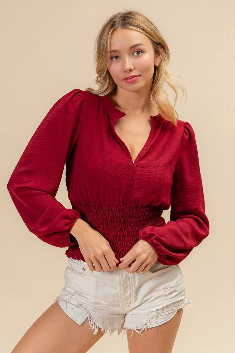 BiBi Smoking Waist Band and Puff Sleeves Deep V Neck Top