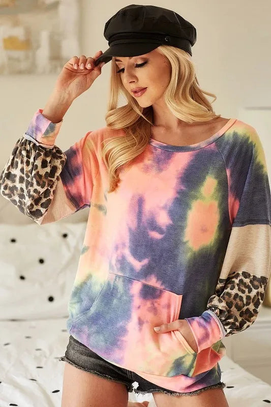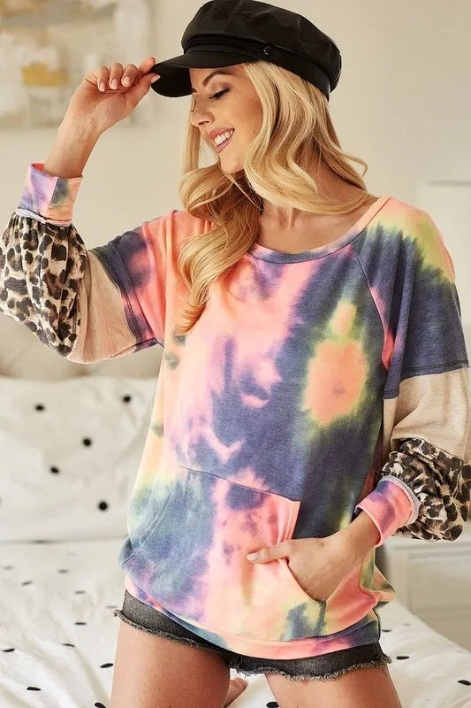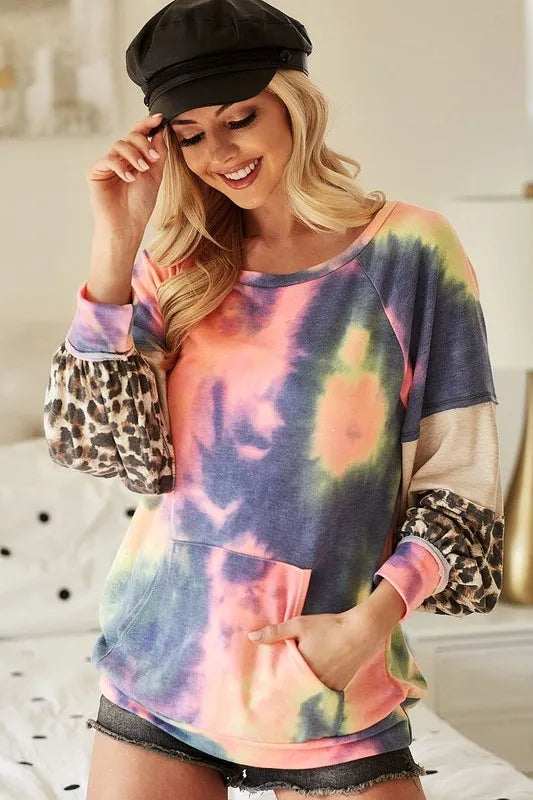 The Tie Dye French Terry Pullover Top with Contrast detailing combines comfort with style for a trendy look. The tie-dye pattern adds a playful and colorful touch to the French terry fabric, making it a casual yet fashionable piece. The contrast detailing adds visual interest and helps highlight the tie-dye design. This pullover top is perfect for a relaxed and laid-back outfit with a pop of personality. Pair it with your favorite jeans or leggings for a cozy and chic look. The combination of tie-dye and contrast detailing creates a modern and stylish top that is perfect for casual occasions.