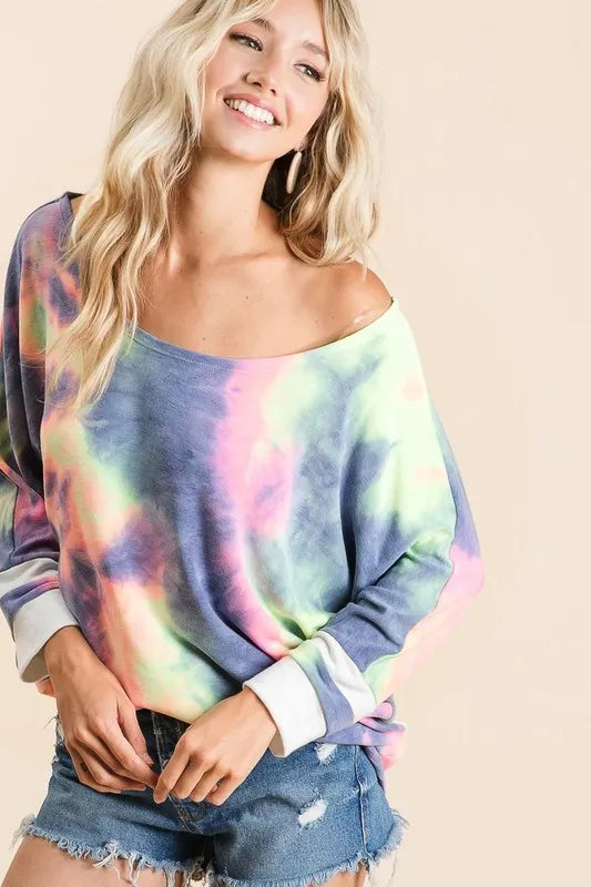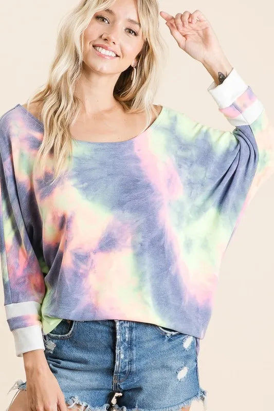 This tie-dye French terry top with contrast cuffs is a stylish and modern addition to your casual wardrobe. The tie-dye pattern adds a fun and vibrant touch to the top, perfect for a laid-back look. The contrast cuffs provide a unique and trendy detail that adds interest to the design. Made from French terry fabric, this top is soft and comfortable for all-day wear. Stay on-trend with this chic tie-dye French terry top with contrast cuffs.