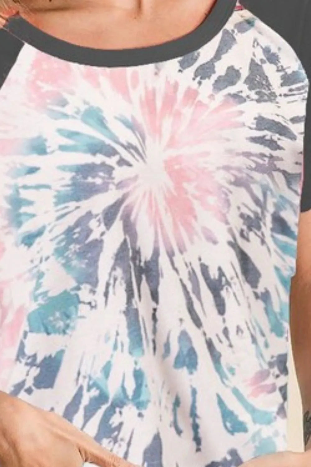 This tie-dye French terry top with short raglan sleeves is a trendy and casual addition to your wardrobe. The tie-dye pattern adds a fun and colorful touch to the top, perfect for adding a pop of style to your outfit. The short raglan sleeves provide a sporty and relaxed look. Made from French terry fabric, this top is comfortable and easy to wear. Pair it with your favorite jeans or shorts for a laid-back and fashionable ensemble. Stay chic and on-trend with this cute tie-dye French terry top with short raglan sleeves.