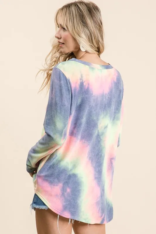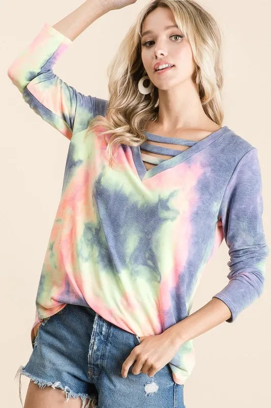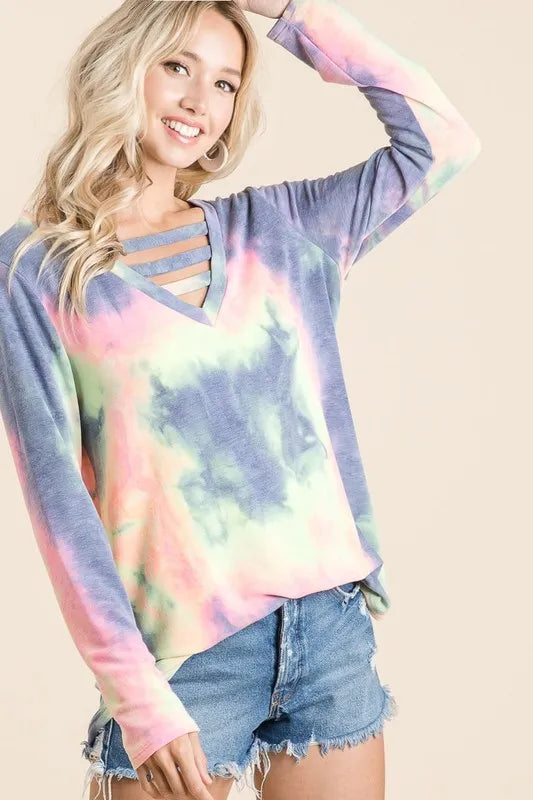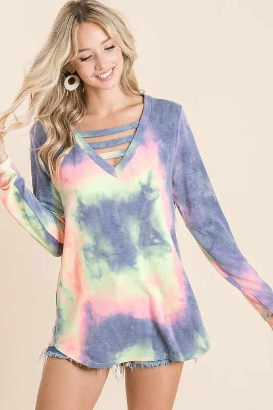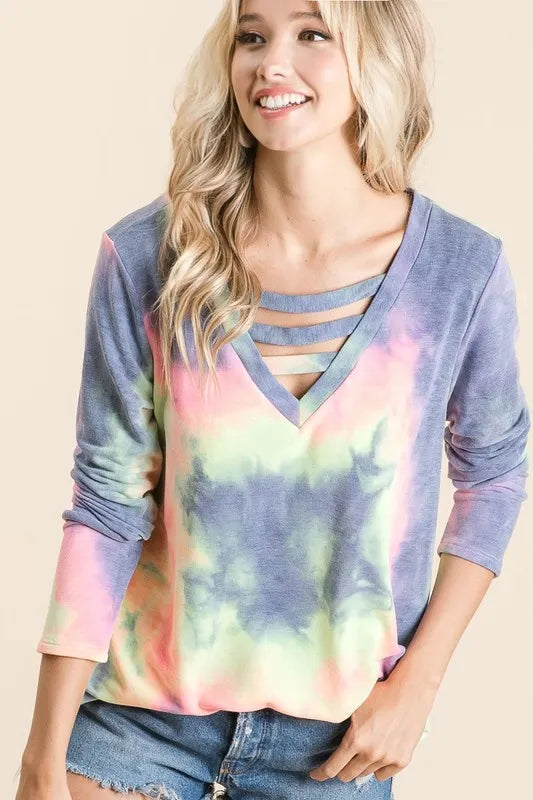 Embrace a laid-back and trendy style with this Tie Dye French Terry V-neck Top featuring unique straps. The tie-dye design adds a pop of color and personality to your outfit, perfect for a fun and casual look. The French terry fabric ensures comfort and softness against the skin. The V-neckline and straps provide a stylish and modern touch to the top. Pair this top with your favorite jeans or shorts for a relaxed and fashion-forward ensemble that exudes effortless chic.