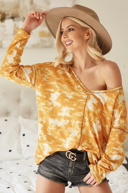 BiBi Tie Dye Print Waffle V Neck Top with Contrast
