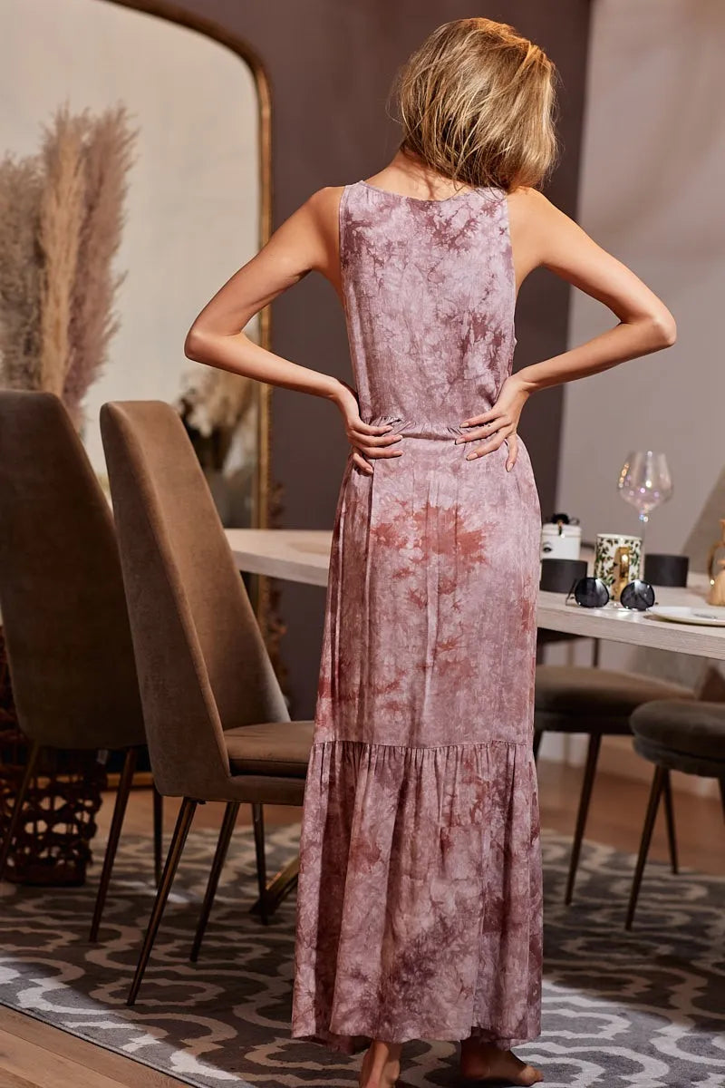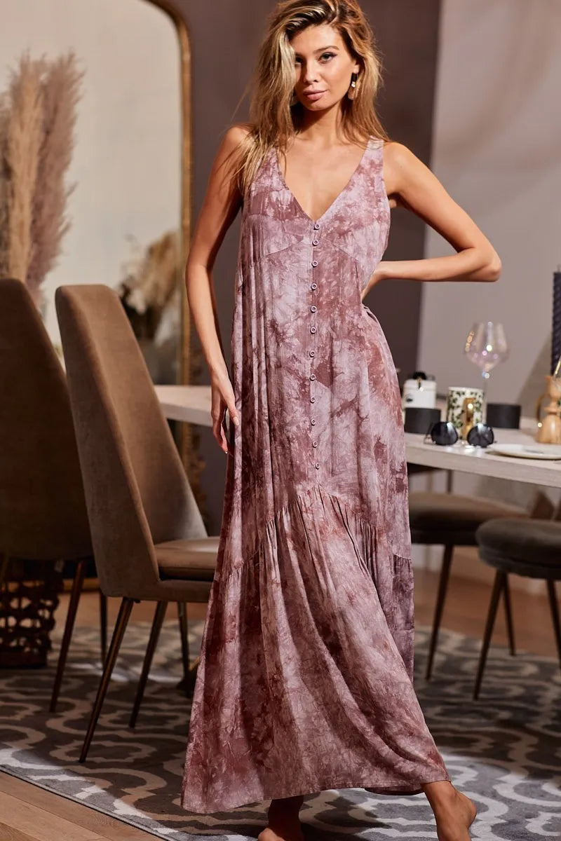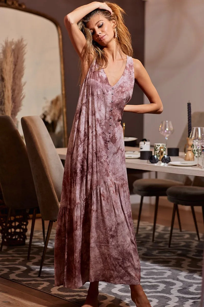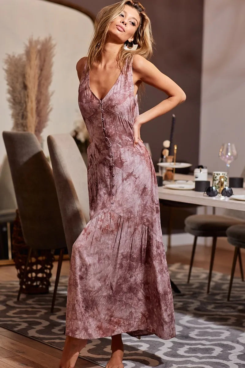 This Sleeveless V-neck Dress features a trendy tie-dye print that adds a fun and colorful touch to the outfit. The sleeveless design and V-neckline offer a chic and breezy style that is perfect for warm weather. Whether you're heading to the beach, a summer party, or a casual outing, this dress is a versatile and playful option for a relaxed yet fashionable look.