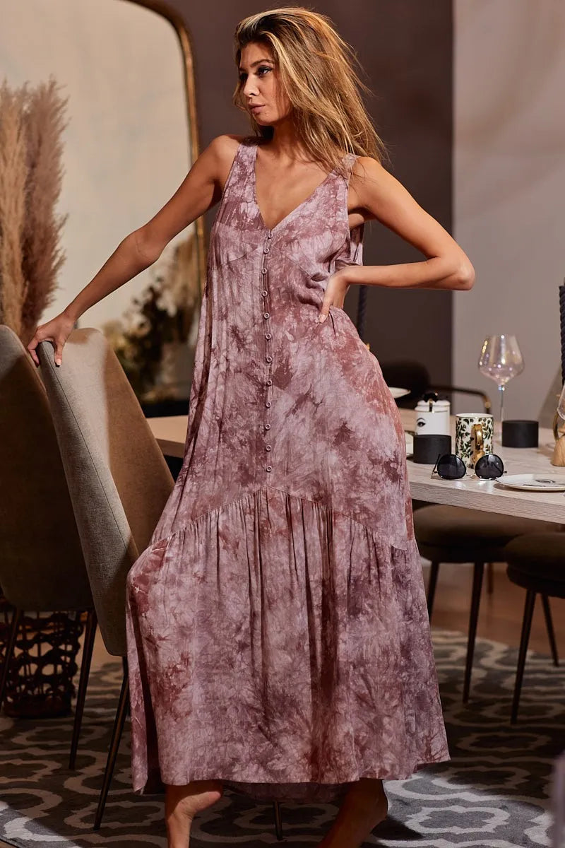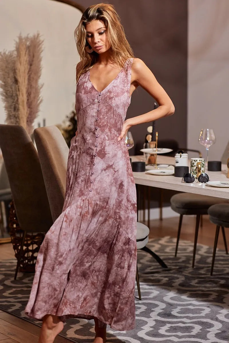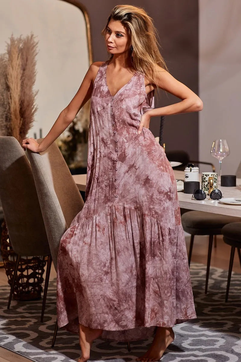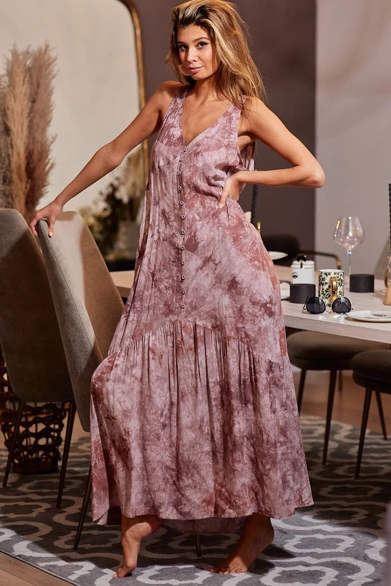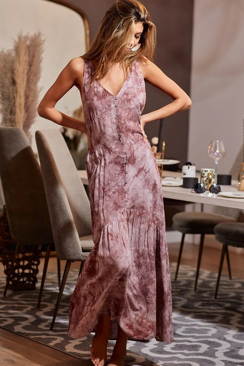 This Sleeveless V-neck Dress features a trendy tie-dye print that adds a fun and colorful touch to the outfit. The sleeveless design and V-neckline offer a chic and breezy style that is perfect for warm weather. Whether you're heading to the beach, a summer party, or a casual outing, this dress is a versatile and playful option for a relaxed yet fashionable look.