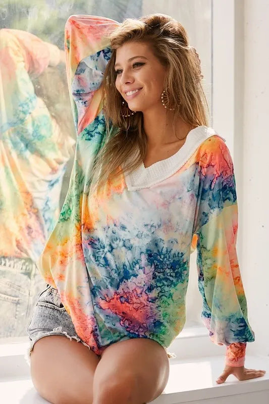 The Tie Dye Soft Knit Jersey V-Neck Top blends comfort and style with its soft knit jersey fabric and trendy tie-dye design. The V-neck adds a flattering touch to the top, making it a versatile piece for casual outings. This top is perfect for adding a pop of color and fun to your everyday look.