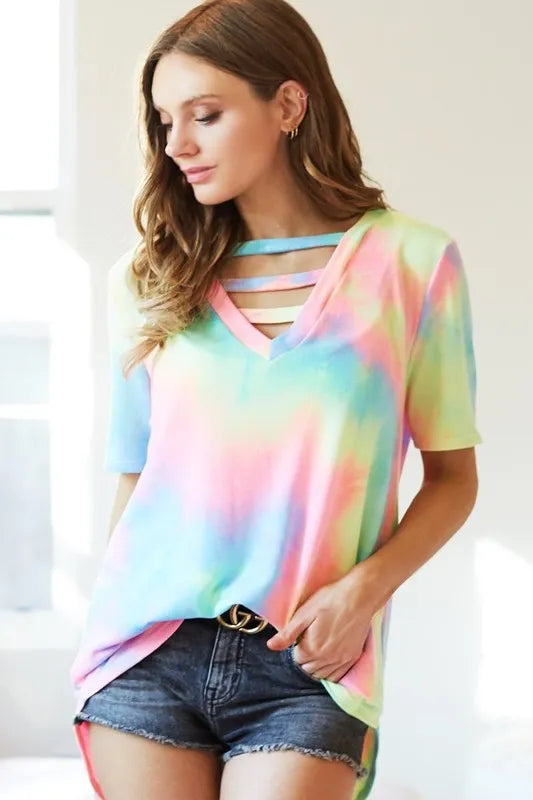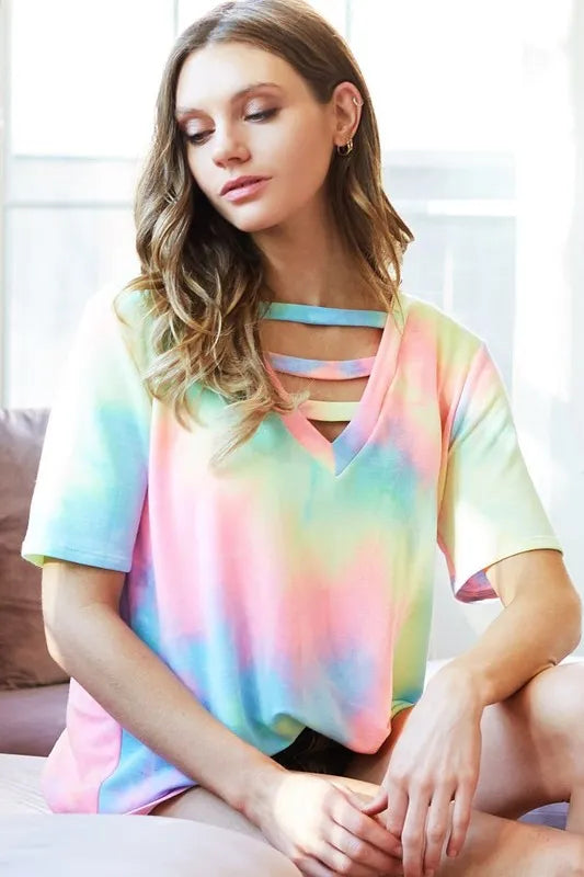 The Tie Dye Terry V-neck Top with Strapped Front Neck is a trendy and unique piece for your wardrobe. The tie-dye print adds a fun and vibrant touch to the soft terry fabric. The V-neckline is flattering and versatile for various body types. The strapped front neck detail adds a stylish and edgy element to the top. Ideal for a casual day out or a summer gathering, this top can be paired with shorts or jeans for a cool and fashionable look.