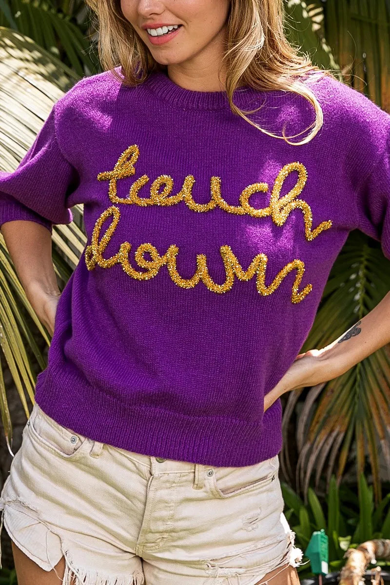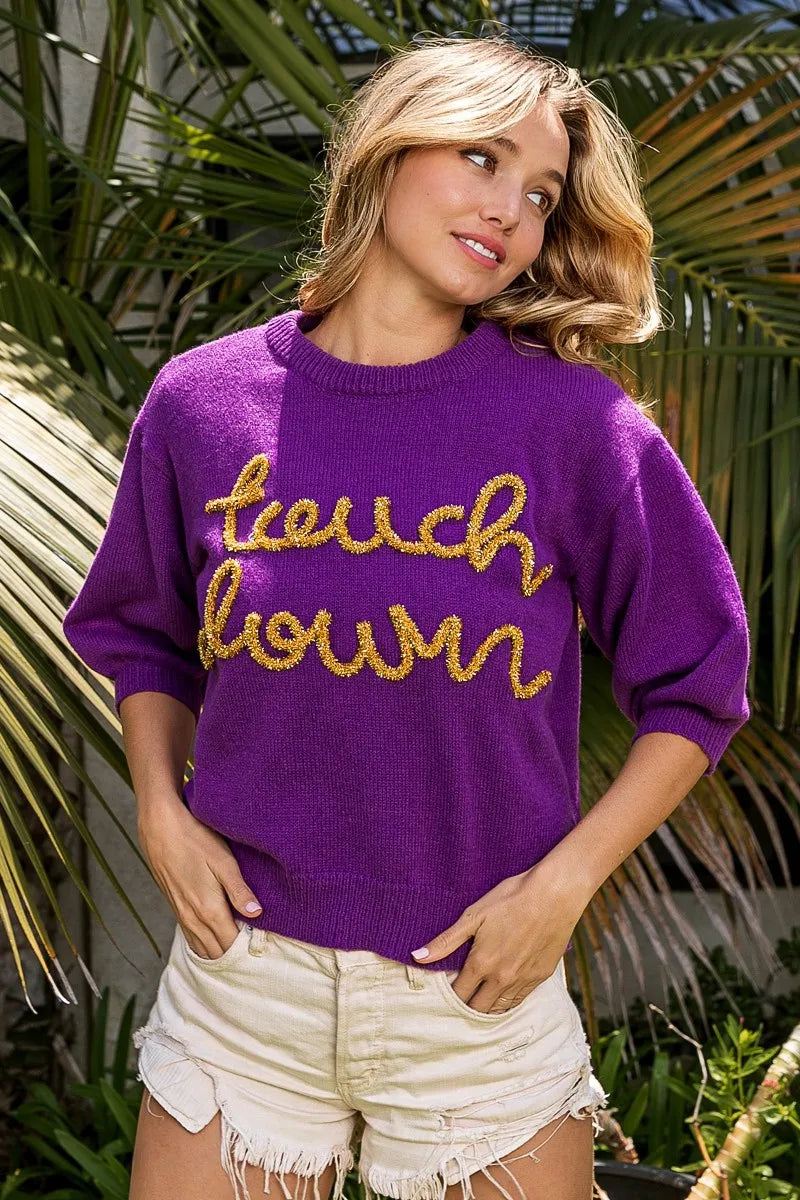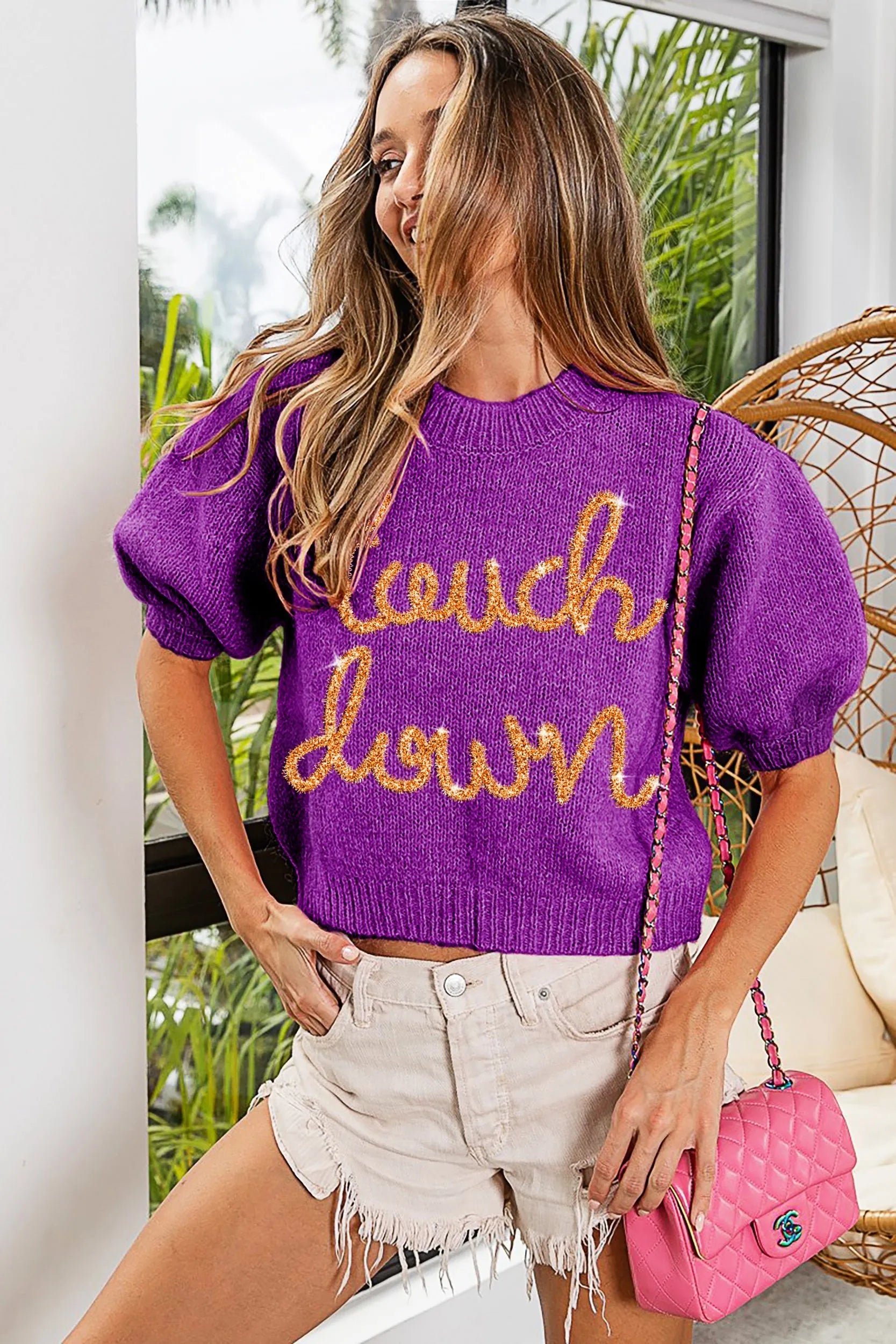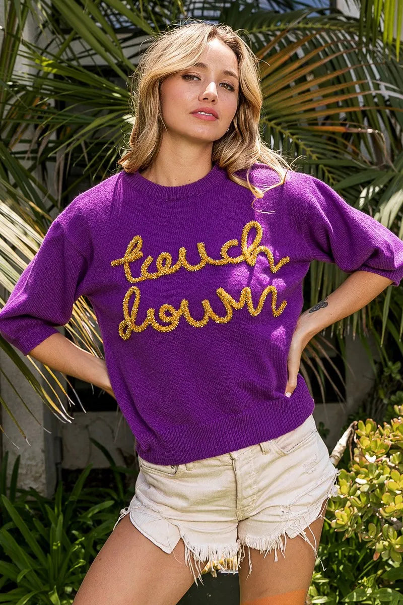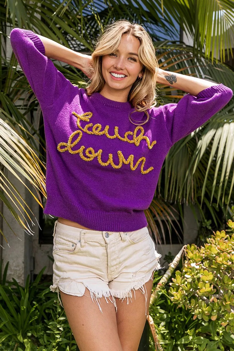 The Touchdown Metallic Letter Puff Sleeve Sweater is a stylish and trendy piece that combines athletic-inspired detailing with a touch of glamour. The metallic lettering adds a pop of shine and character to the sweater. The puff sleeves provide a feminine and on-trend silhouette. This sweater is a versatile option that can be dressed up or down depending on the occasion. Stay fashionable and comfy in this statement-making piece!