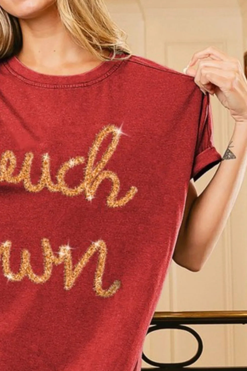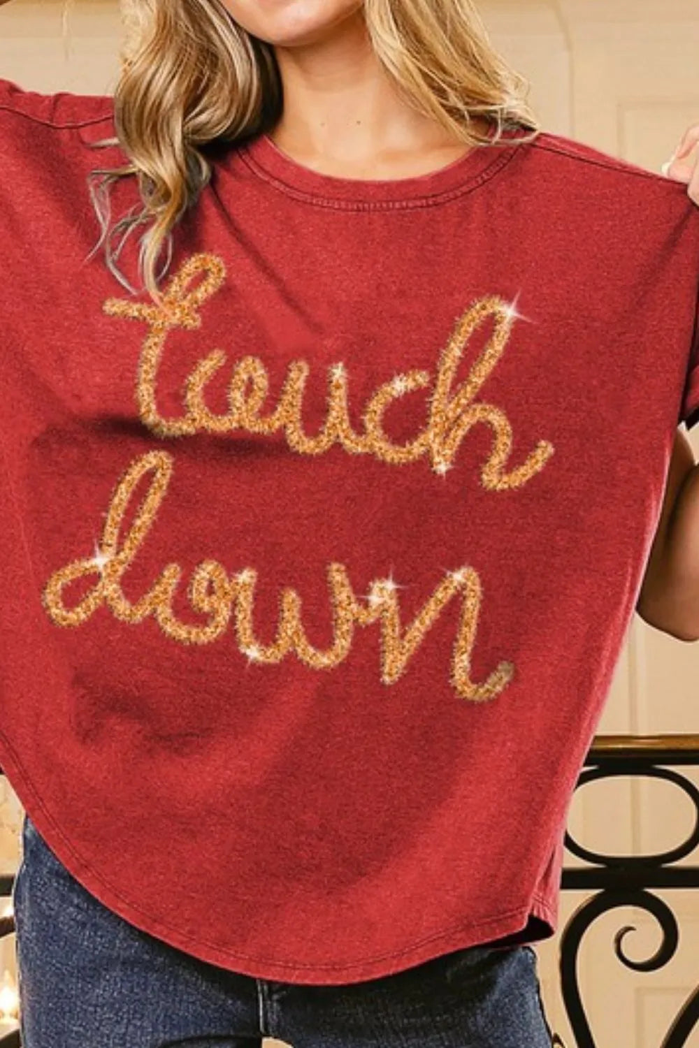 This vintage washed top features metallic lettering that says "Touchdown," perfect for showing off your sporty style. The metallic lettering adds a touch of shine and glamour to the design. Made with a vintage washed fabric for a retro look and comfortable feel. Score some style points with this trendy and unique Touchdown metallic letter vintage washed top!