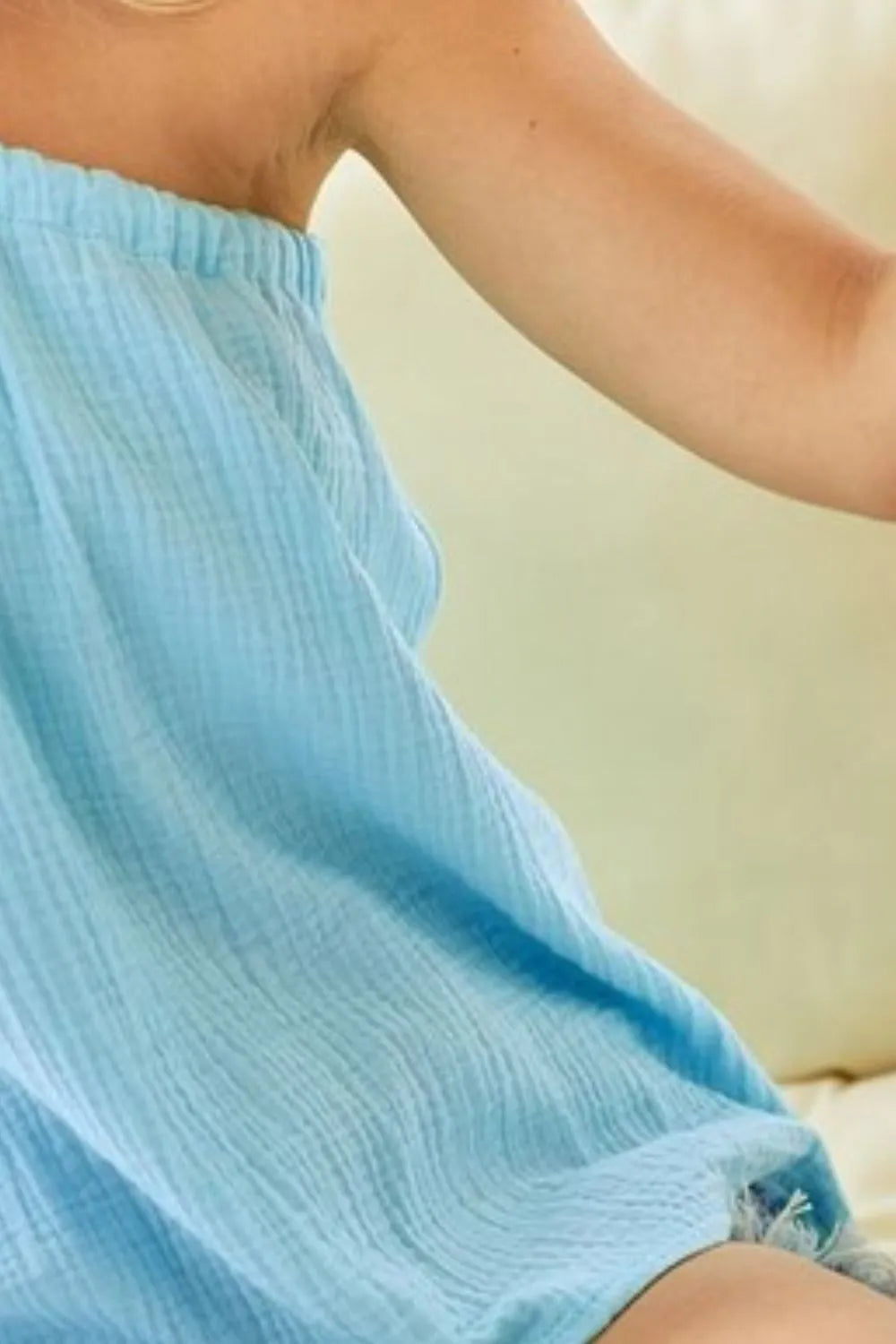 The washed cotton gauze woven tie ribbon detailed top is a breezy and charming addition to your wardrobe. The washed cotton gauze fabric offers a soft and lightweight feel, perfect for warm weather. The tie ribbon detailing adds a feminine and elegant touch to this top. Pair it with shorts or a skirt for a relaxed and stylish outfit. Embrace the effortless and bohemian style of this washed cotton gauze woven tie ribbon detailed top for a chic and summery look.