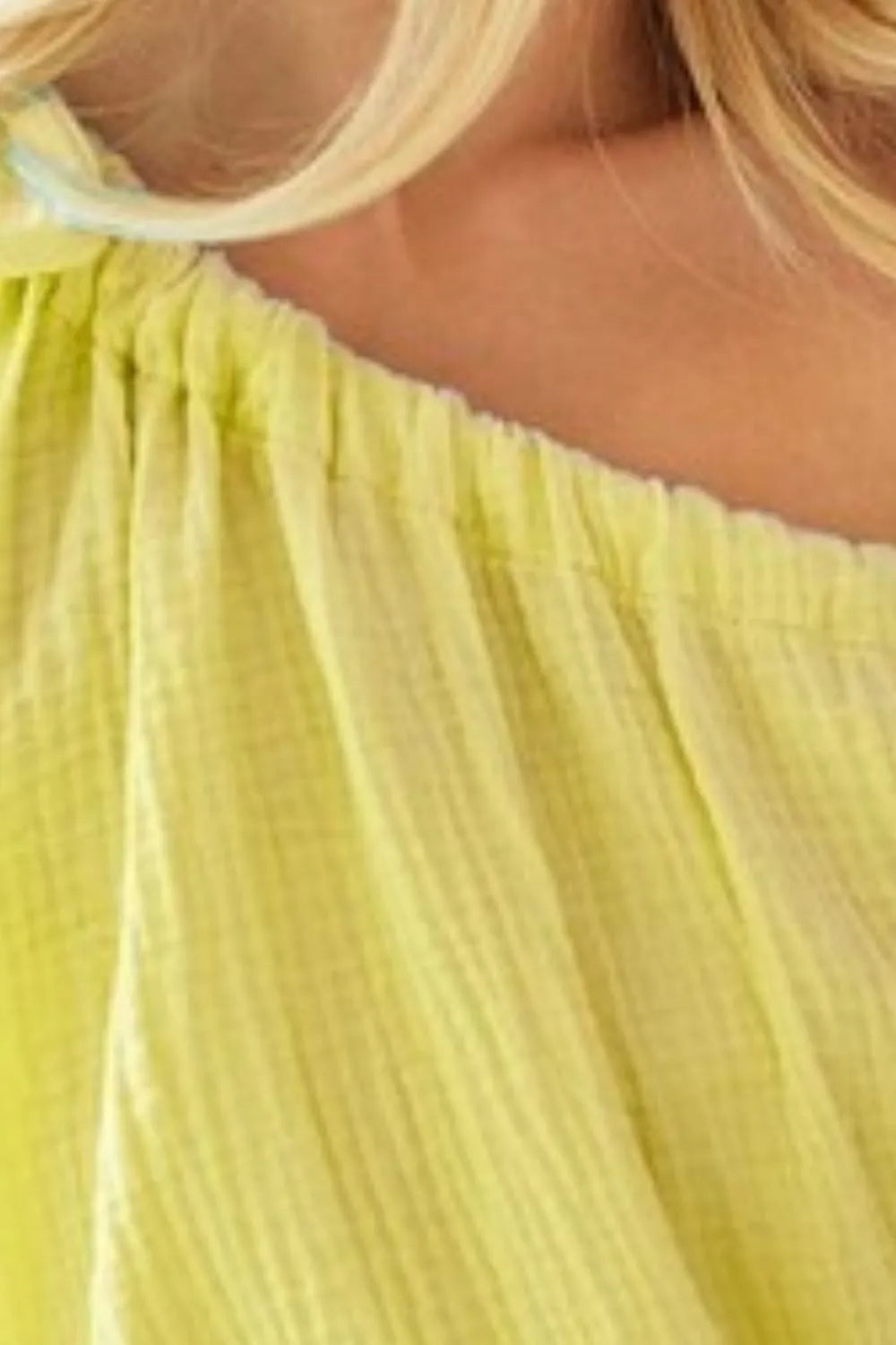 The washed cotton gauze woven tie ribbon detailed top is a breezy and charming addition to your wardrobe. The washed cotton gauze fabric offers a soft and lightweight feel, perfect for warm weather. The tie ribbon detailing adds a feminine and elegant touch to this top. Pair it with shorts or a skirt for a relaxed and stylish outfit. Embrace the effortless and bohemian style of this washed cotton gauze woven tie ribbon detailed top for a chic and summery look.