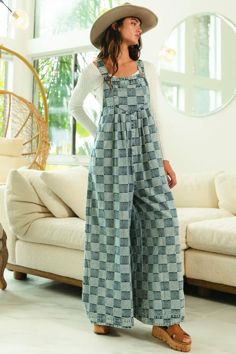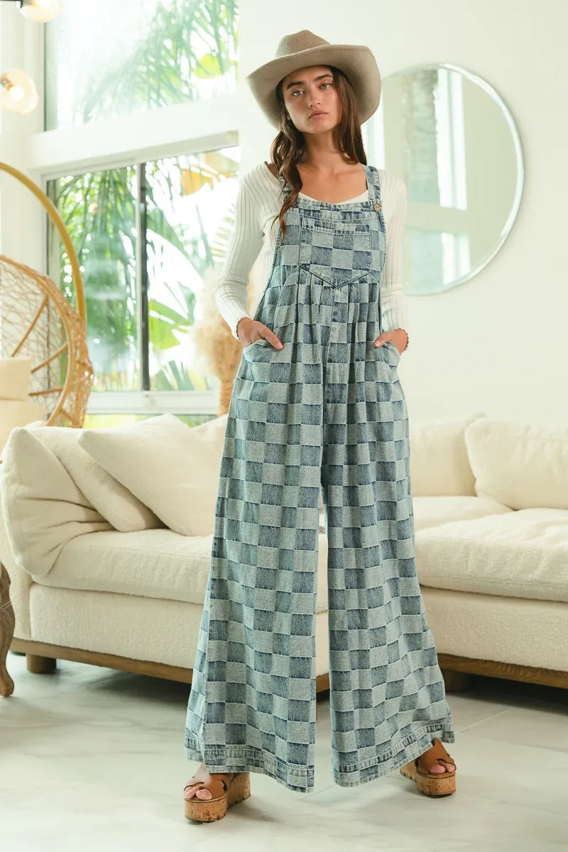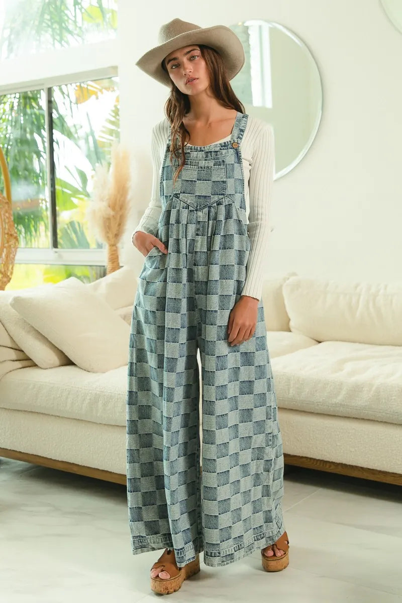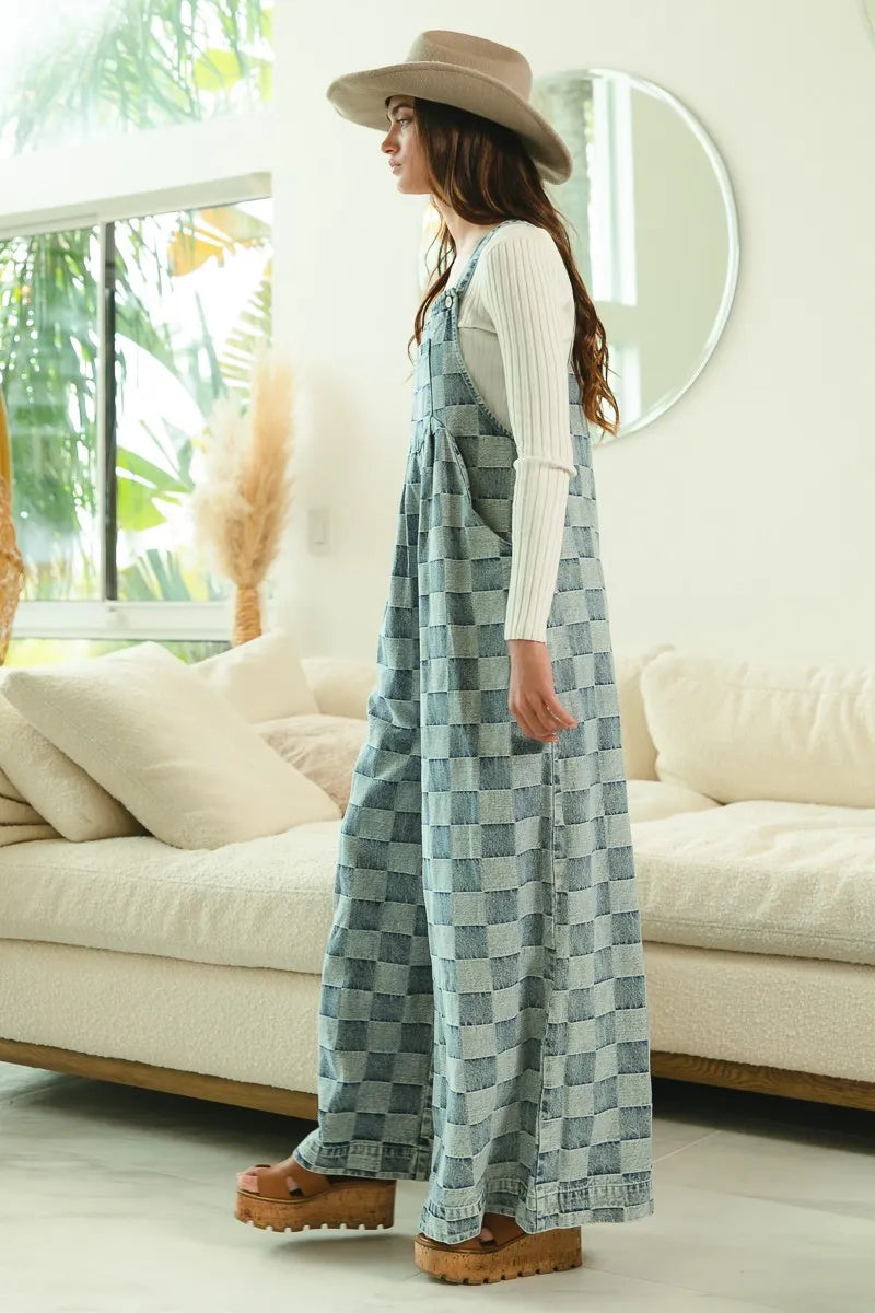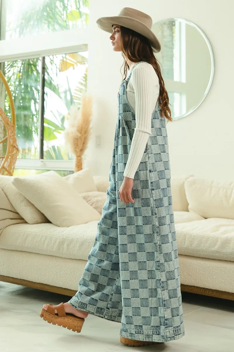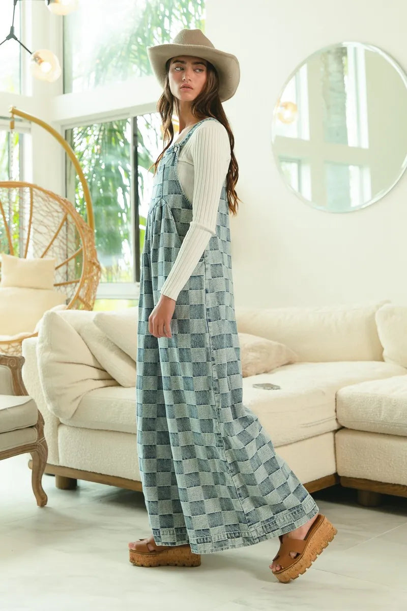 These washed vintage checker wide legs overalls are a stylish and nostalgic addition to your wardrobe. With a unique pattern and wide leg design, they are sure to make a statement. Pair them with a simple top for a fashionable and comfortable look. Perfect for casual outings or creative styling, these overalls are versatile and fun.