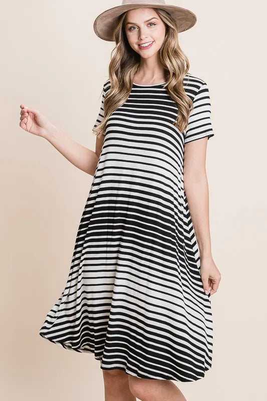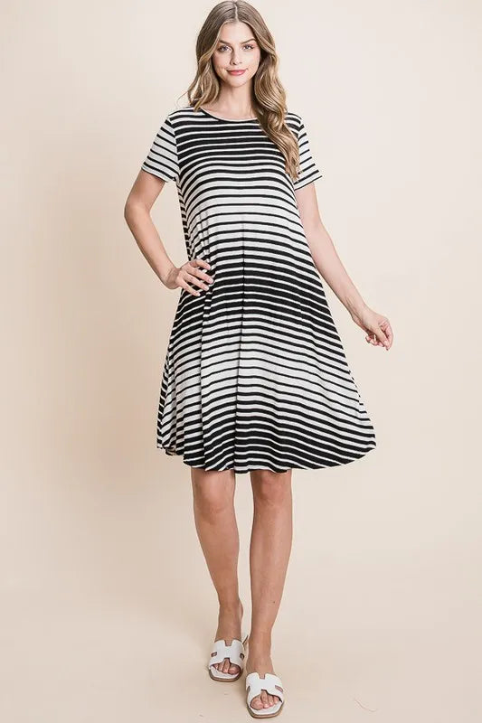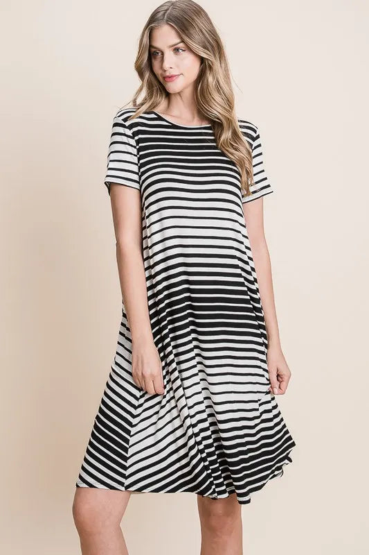 The Casual Stripe Round Neck Tee Dress is a versatile and effortless piece for everyday wear. With classic stripe detailing, this dress offers a casual and chic look. Featuring a comfortable round neck and soft fabric, it is perfect for running errands or casual outings. Update your wardrobe with this stylish and easy-to-wear tee dress.