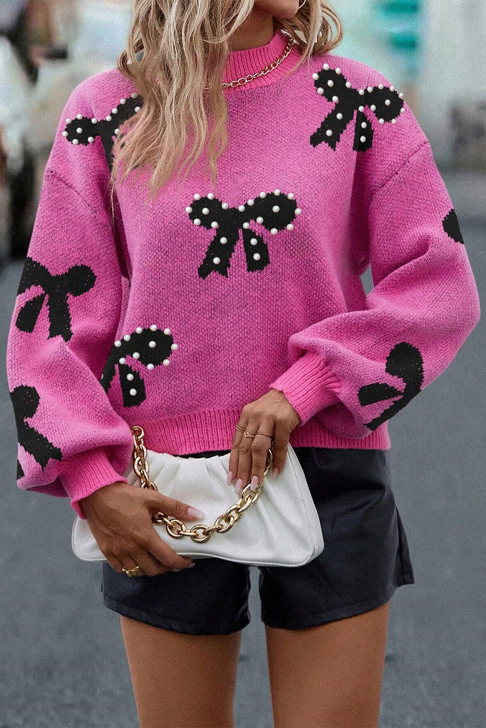 Bright Pink Pearl Embellished Bow Pattern Loose Sweater