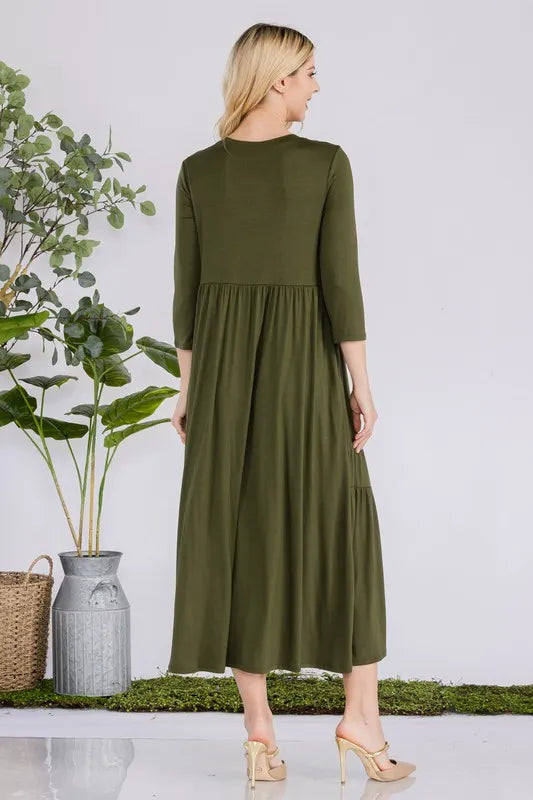 This midi-dress showcases a solid color print and an asymmetric tiered design for a modern and stylish look. The unique tiered hem adds movement and flare to the dress, creating a flattering silhouette. With its solid color print, this dress is versatile and easy to style for various occasions. Made with high-quality fabric, it offers comfort and elegance for all-day wear. Elevate your wardrobe with this chic and sophisticated midi-dress that will make you stand out in any setting.