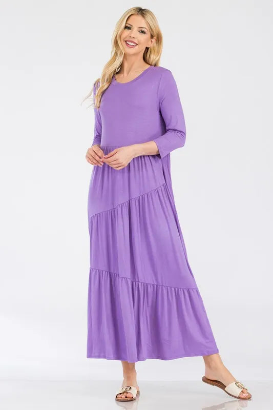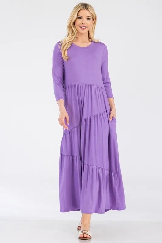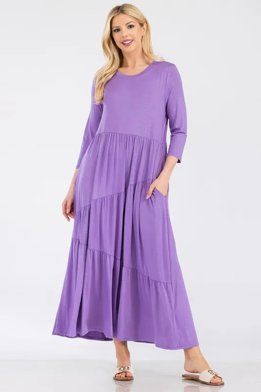 This midi-dress showcases a solid color print and an asymmetric tiered design for a modern and stylish look. The unique tiered hem adds movement and flare to the dress, creating a flattering silhouette. With its solid color print, this dress is versatile and easy to style for various occasions. Made with high-quality fabric, it offers comfort and elegance for all-day wear. Elevate your wardrobe with this chic and sophisticated midi-dress that will make you stand out in any setting.