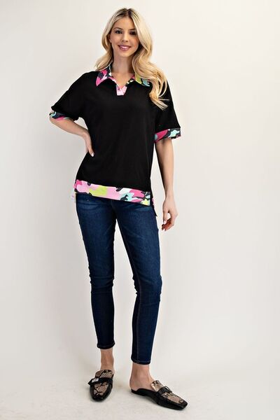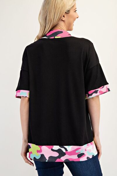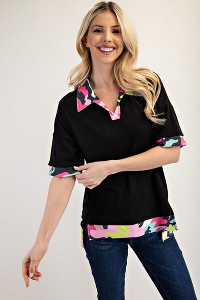 Stand out confidently in this Vibrant Camo Collar Top, where bold fashion meets casual comfort. Crafted from a lightweight waffle knit fabric, this top features a stunning pop-off with eye-catching camo print accents on the collar, cuffs, and hem. The relaxed fit and short sleeves provide an effortlessly chic look, while the side slits add an element of versatility for layering or movement.