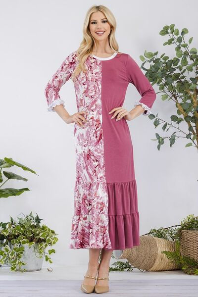 This modest midi-dress is decorated with color contrast, tie dye. This 3/4 ruffle sleeve piece is designed with a round neck, tiered ruffle skirt, and concealed side pockets. This dress is perfect for weekends, school, and summer fall transition.